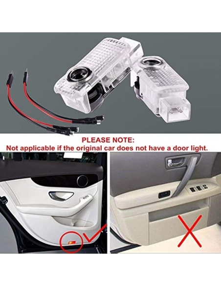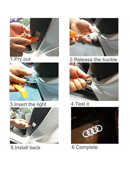 1. Facile da installare: sostituzione diretta. Nessuna modifica richiesta. Nessun taglio del filo. 2. Il pacchetto include: 4 luci LOGO compatibili con Audi. Specifiche: Potenza in ingresso: 5 W (ogni lampadina LED) Voltaggio: DC 12/24 V Compatibile con: (Solo per Audi) Audi A1 2012-2019 Audi A3 2014-2019 Audi A4 2003-2019(A4 2005 non adatta, fai attenzione!! ) Audi A4L 2009-2019 Audi A5 2008-2019 Audi A6 2000-2014 Audi A6L 2005-2019 Audi A7 2012-2019 Audi A8 2004-2019 Audi Q3 2012-2019 Audi Q7 2006-2019 Audi R8 2007-201 9AudiTT2007- 2019 Non per la serie Q5. 1. Si prega di ricontrollare il manuale del proprietario del veicolo o la lampadina originale per confermare la dimensione della luce corretta necessaria prima di effettuare l'ordine per evitare problemi di restituzione. 2. Non si applica se l'auto originale non ha luci sulle portiere. Come sostituire la luce della portiera dell'auto (Istruzioni per l'installazione): 1. Utilizzare un cacciavite a testa piatta per rimuovere e scollegare le luci originali della porta; 2. Collegare le nuove luci della porta con il connettore corrispondente; 3. Metti le nuove luci della porta nel punto in cui si trovavano le luci originali; 4. Fatto! Il logo dovrebbe essere proiettato a terra.