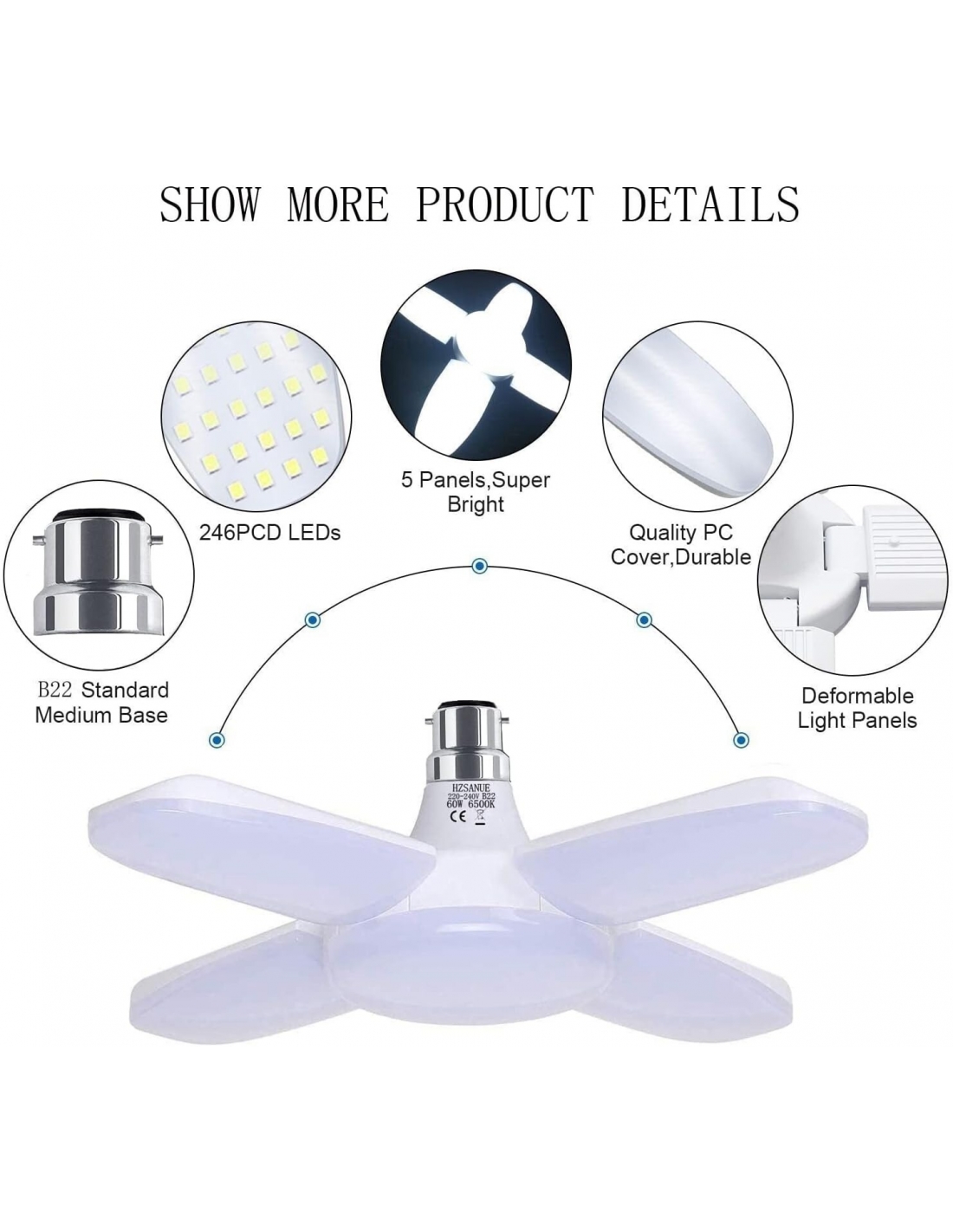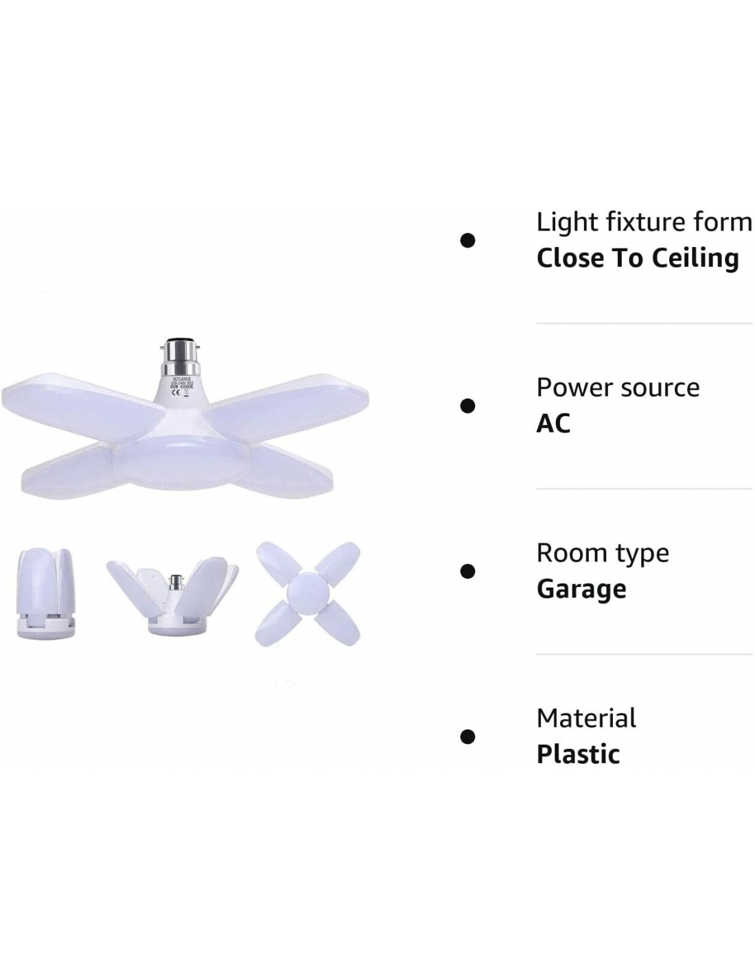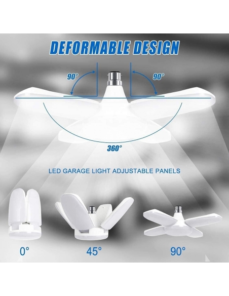 Design regolabile super luminoso: la luce LED per garage fornisce un'emissione di 6800 lumen in bianco diurno 6500K. C'è 1 lampada LED circolare e 4 pannelli LED luminosi con design regolabile grandangolare verso l'alto, per coprire un'area più ampia.