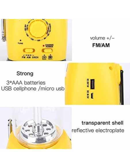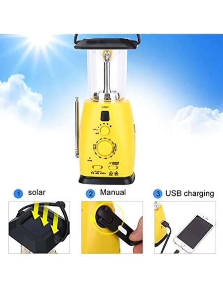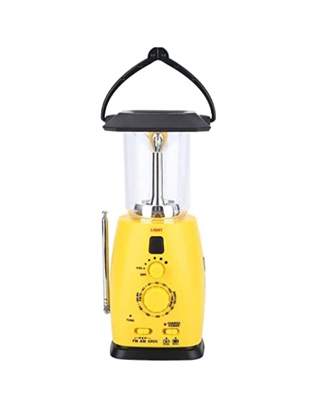 Questa lampada da campeggio ha una lampadina a 8 LED per un'illuminazione intensa. E 'incluso FM / AM per i vostri programmi preferiti. Con il pannello solare e la manovella, è possibile generare energia per cellulare o altro dispositivo portatile compatibile USB.