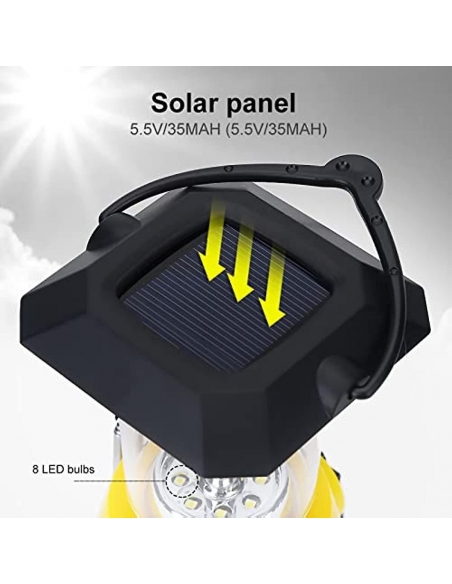 Ricaricabile con il pannello solare e la manovella, è possibile generare energia per telefoni cellulari o altri dispositivi portatili compatibili USB. Questa luce solare da campeggio è ideale per le attività all'aperto: campeggio, escursioni, pesca e situazioni di emergenza. O come fonte di luce per feste notturne per chiunque cerchi un prodotto di qualità e conveniente per godersi il mondo