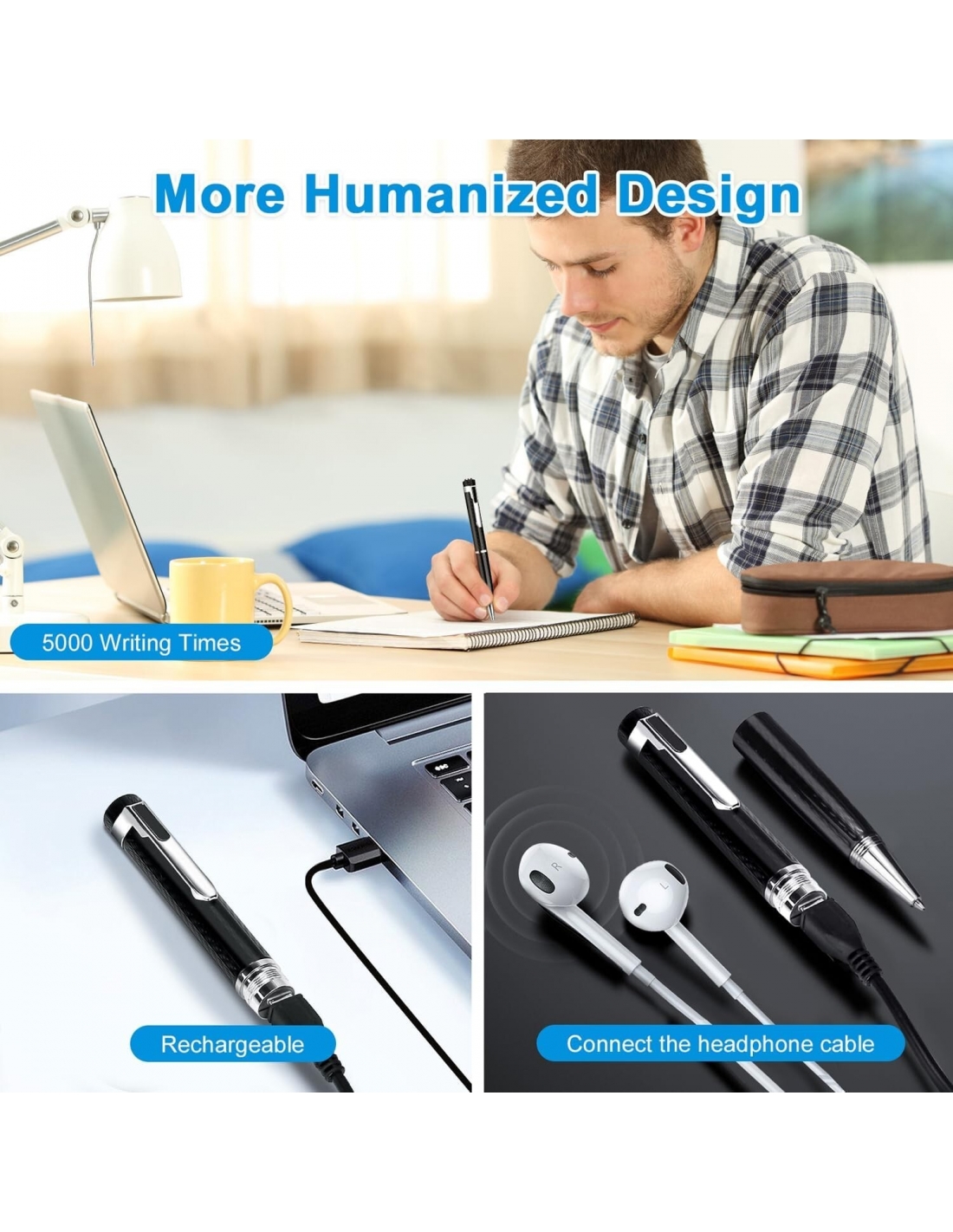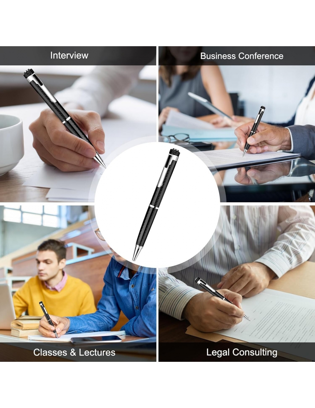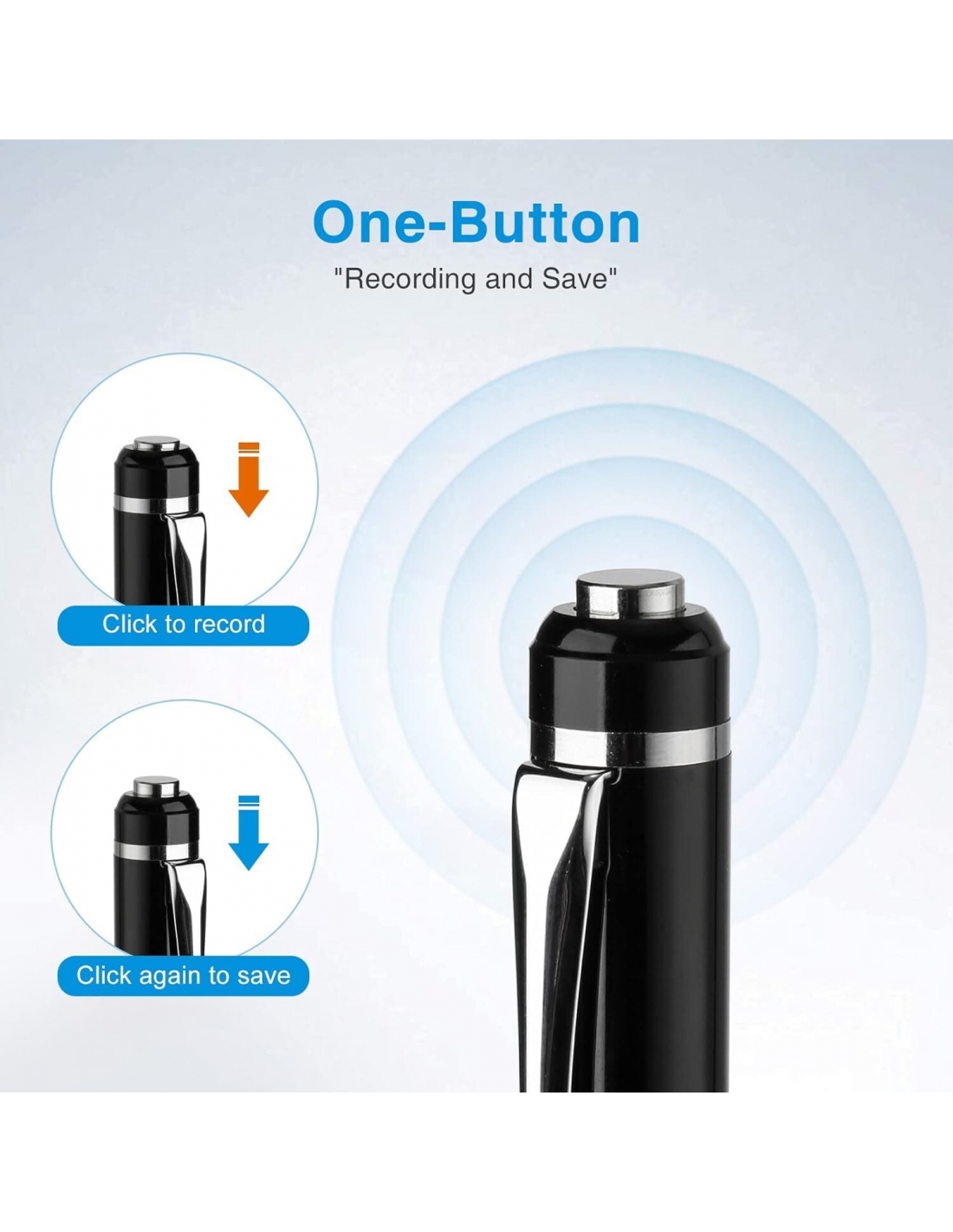 - Design della penna portatile: progettata come una penna unica e pratica, può essere inserita nella borsa o nel cassetto e con la penna puoi prendere appunti durante la registrazione, per non perdere informazioni importanti.