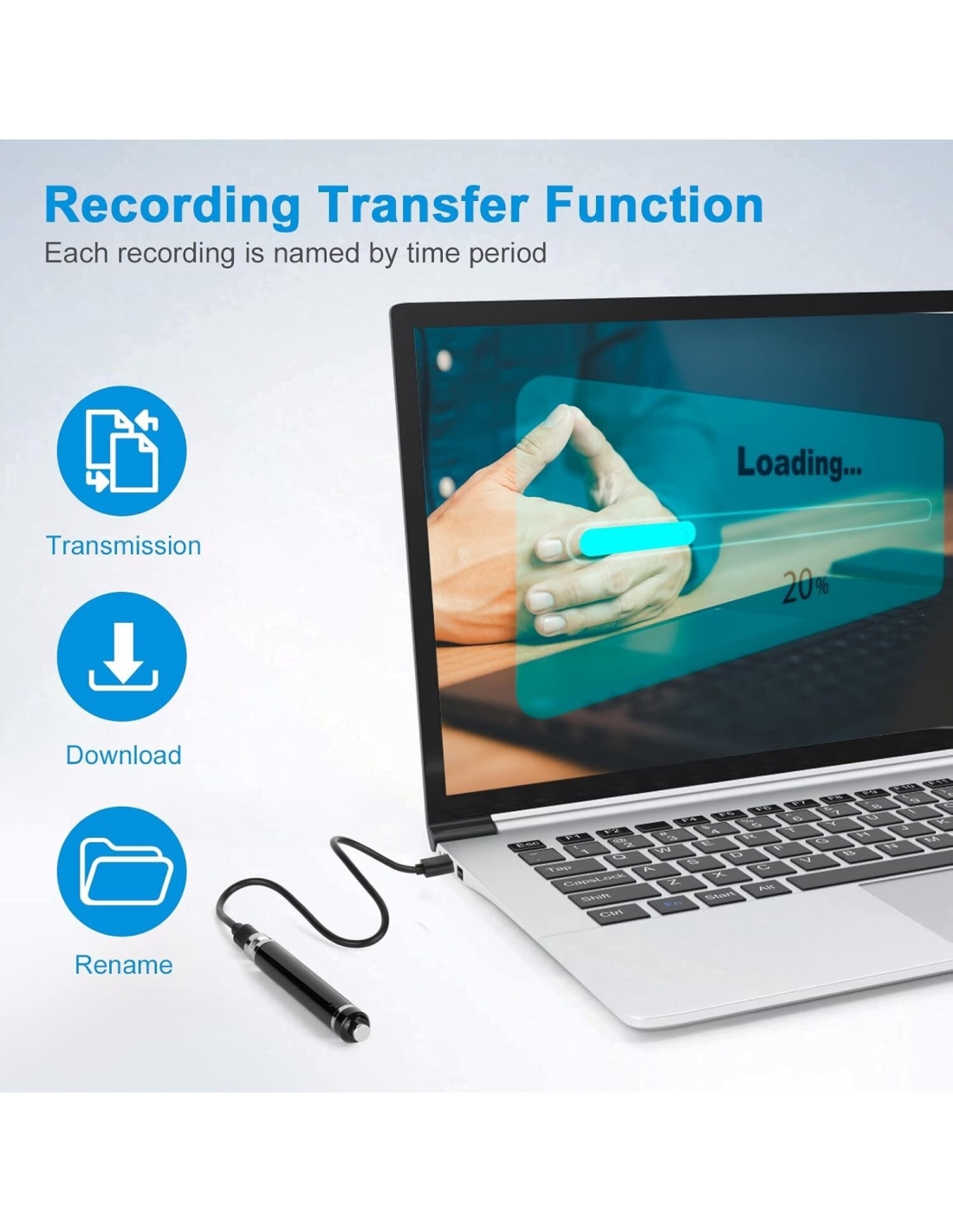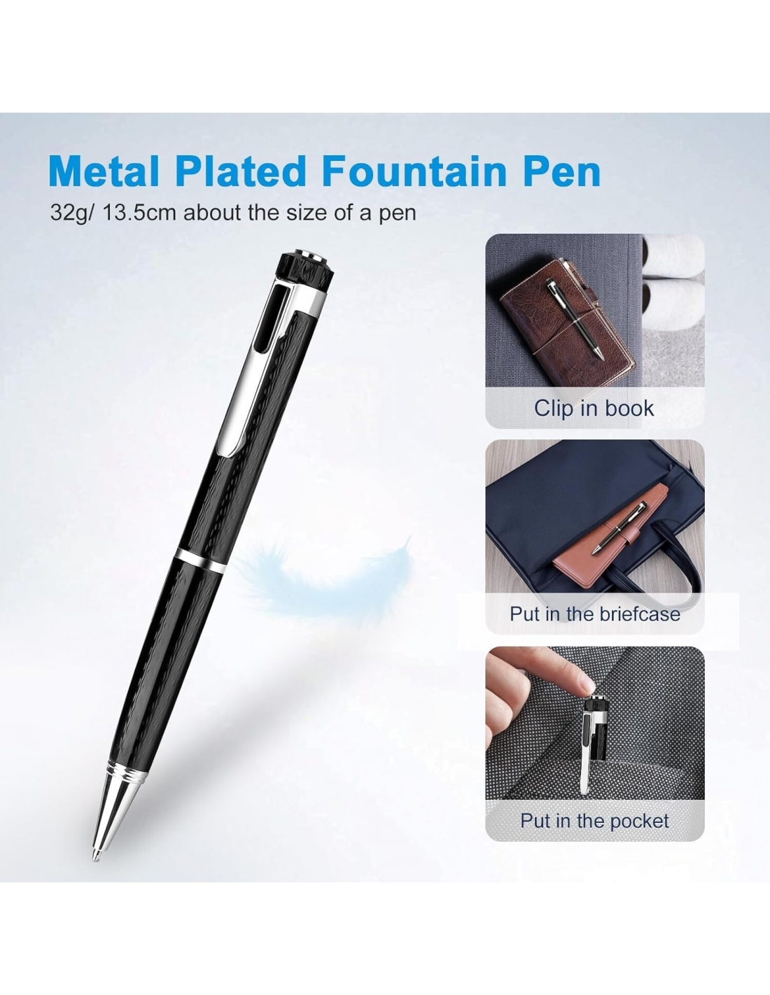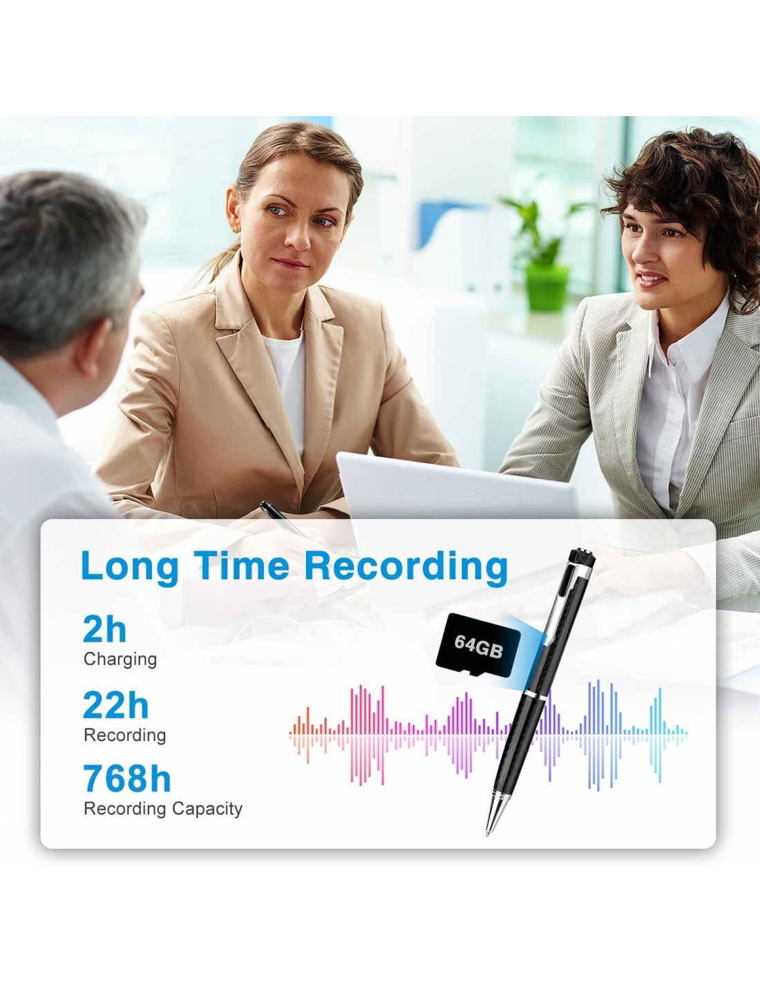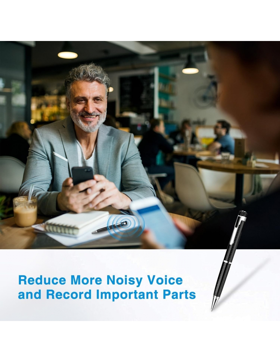 - Design della penna portatile: progettata come una penna unica e pratica, può essere inserita nella borsa o nel cassetto e con la penna puoi prendere appunti durante la registrazione, per non perdere informazioni importanti.