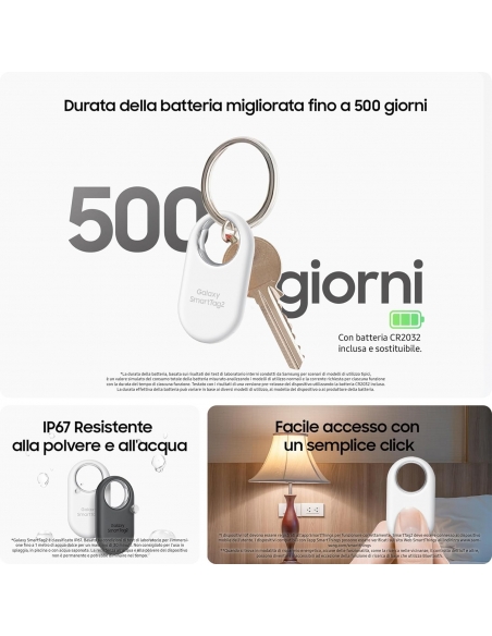- Batteria ottimizzata: Il localizzatore Galaxy SmartTag2 possiede un’autonomia fino a 500 giorni, e fino al 40% in più di batteria con la modalità Risparmio energetico, per avere sempre sotto controllo i tuoi oggetti¹ ² ³