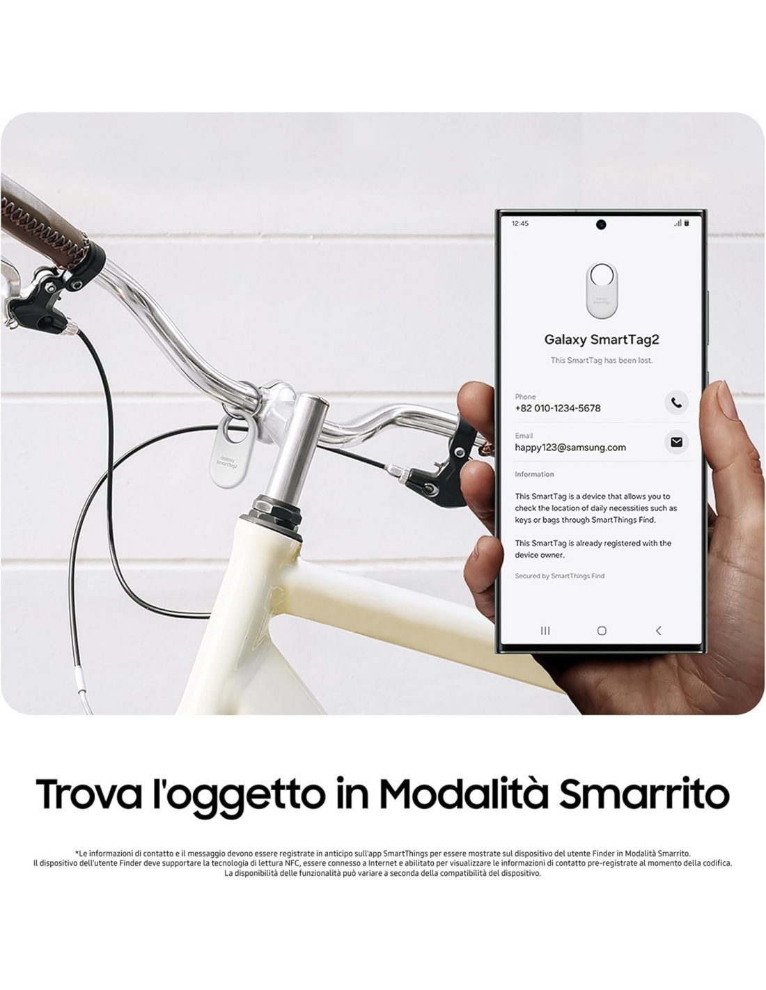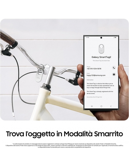 - Modalità Smarrito: Quando la modalità Smarrito è attiva, l’NFC (Near Field Communication) di Galaxy SmartTag2 mostrerà il tuo contatto registrato e un messaggio sullo smartphone di chi lo trova, a prescindere dal sistema operativo⁵