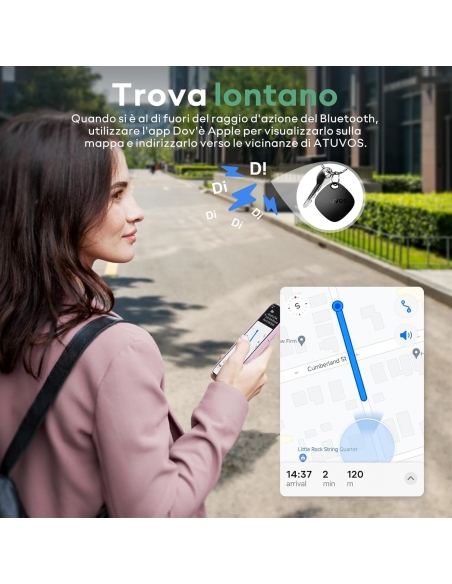 - 【Trova lontano】: Il tag air ATUVOS trova oggetti più lontani con centinaia di milioni di dispositivi Apple nella rete "Dove è". Quando sei fuori dalla portata Bluetooth, usa l'app "Dove è" per visualizzarlo sulla mappa e attivare la navigazione per guidarti nella vicinanza di ATUVOS air tags. (Nessuna tassa mensile o annuale)