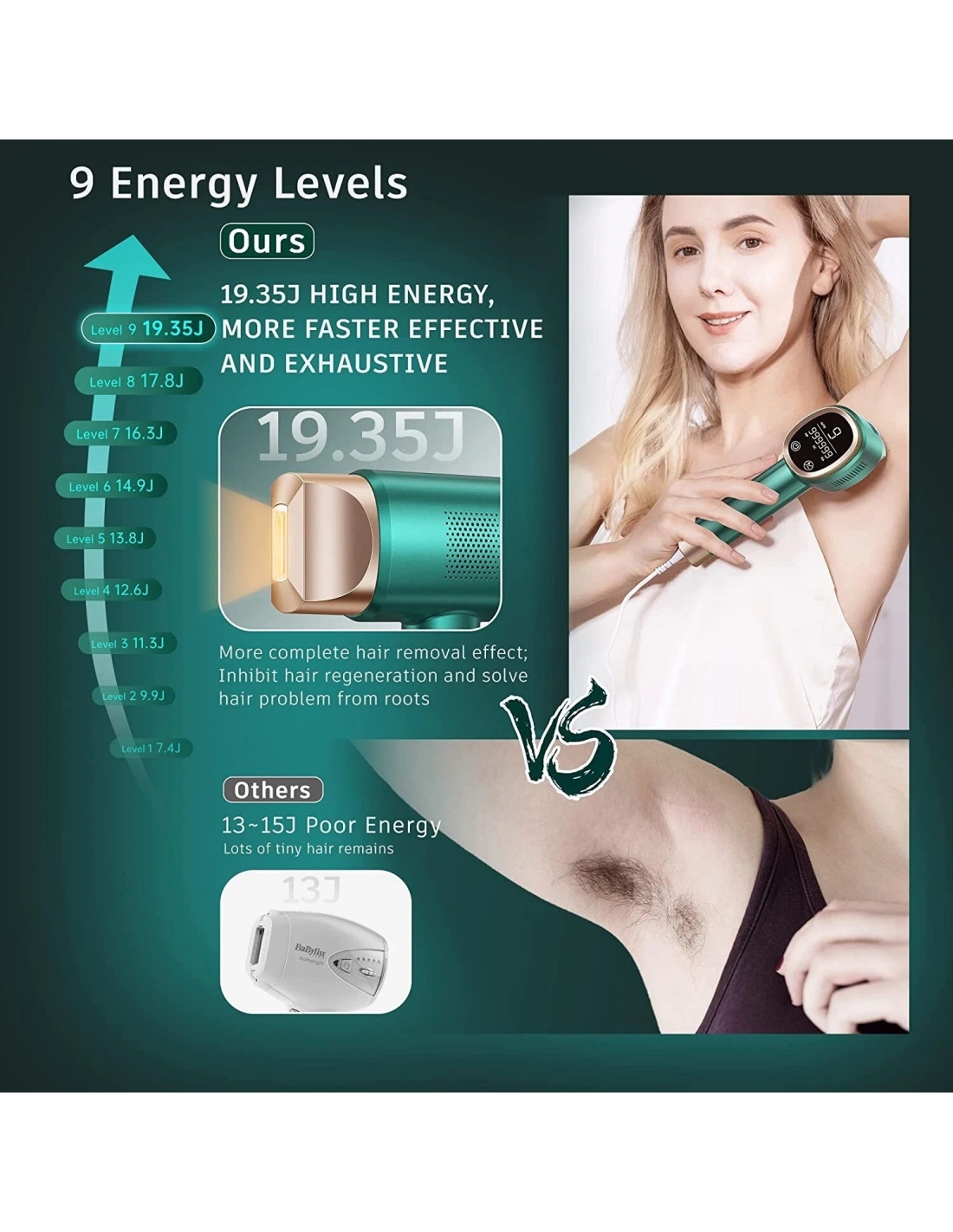 - MAX 19,35J: Prettivo IPL Luce Pulsata Epilatore con un'energia massima di 19.35J è in grado di distruggere i follicoli piliferi dalla radice e lascia la pelle liscia come la seta e senza pelucchi. La riduzione dei capelli è visibile in sole 8-12 settimane.