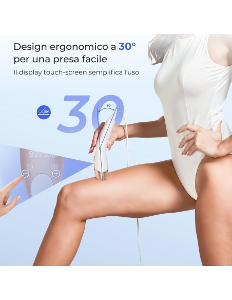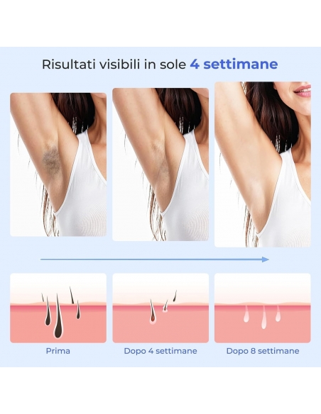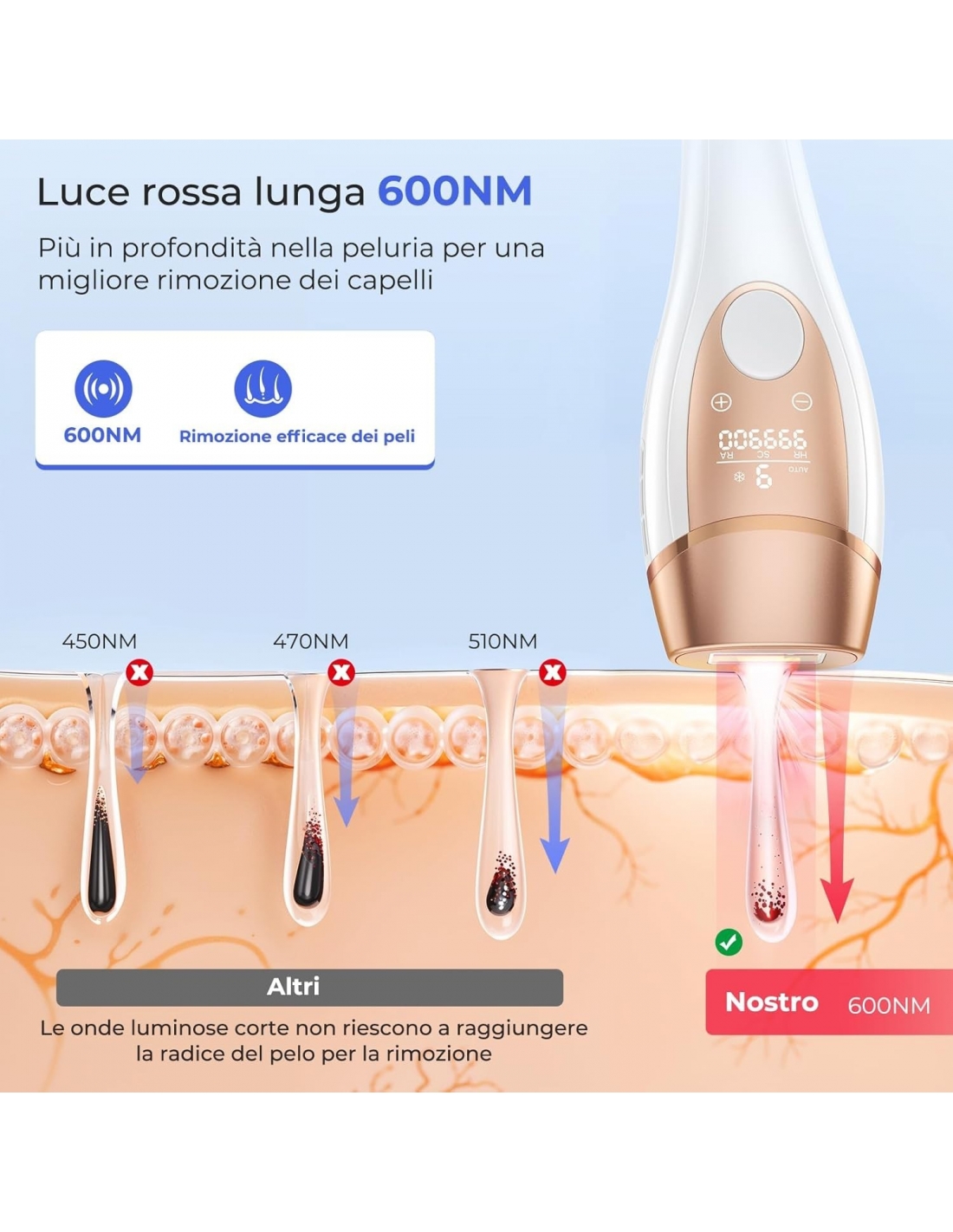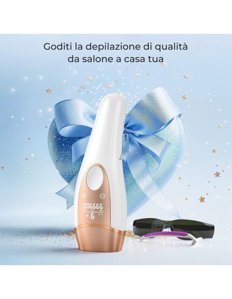 - Tecnologia IPL Avanzata: La tecnologia luce pulsata riduce gradualmente la densità dei capelli superflui in cicli di 8 settimane. Con un uso costante, è possibile ottenere fino al 90% di risultati visibili, lasciando la pelle liscia, morbida e piacevole al tatto su braccia, gambe, schiena e zona bikini. Ideale come depilatore laser o epilatore laser donna per risultati duraturi.