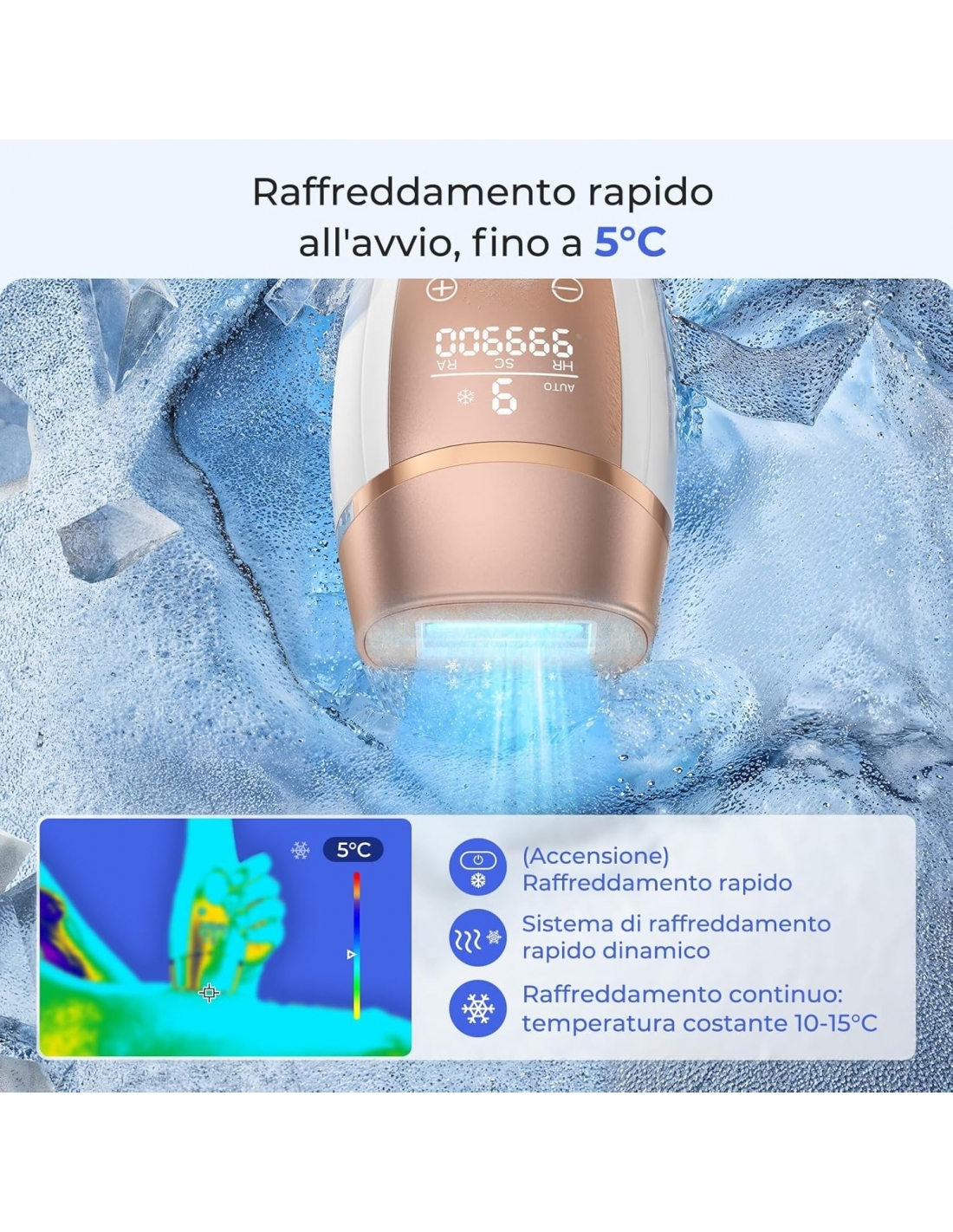 - Tecnologia di Raffreddamento Rapido: Raffreddamento istantaneo all’avvio, mantenendo una temperatura stabile di 10–15°C durante l’uso. Mantiene la pelle confortevole e senza fastidi, ideale per zone delicate come ascelle e linea bikini. Perfetto per chi cerca un epilatore luce pulsata domestico facile da usare.