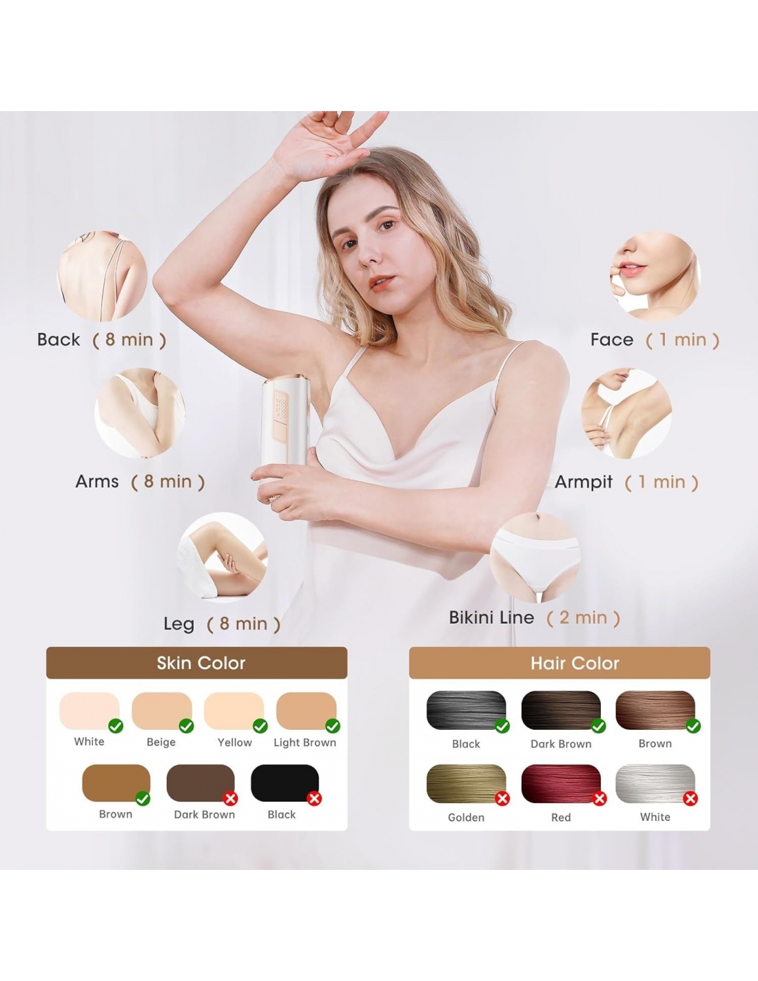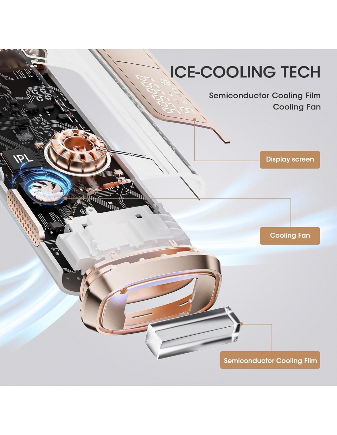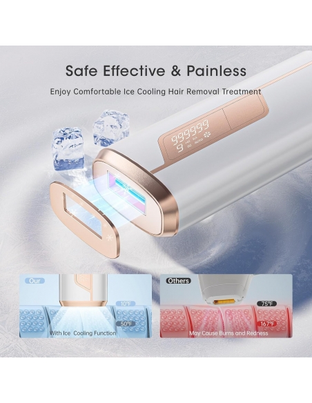 - Questo epilatore luce pulsata per la depilazione ha incorporato 50℉ (10℃) fogli di congelamento, avvia la modalità di raffreddamento all'accensione, può raffreddare la pelle durante l'emissione della luce pulsata con un'esperienza indolore di raffreddamento a ghiaccio e confortevole.