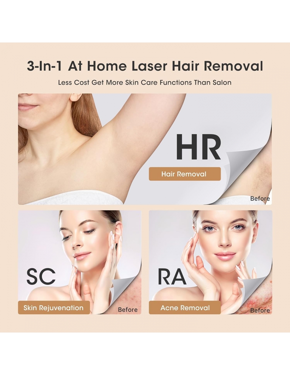 - Questo laser luce pulsata epilatore dei capelli ha una funzione 3-in-1 HR/SC/RA per la rimozione dei capelli , che consente di ottenere risultati di cura della pelle durante la rimozione dei capelli . Il dispositivo è un must per chiunque desideri una pelle liscia.