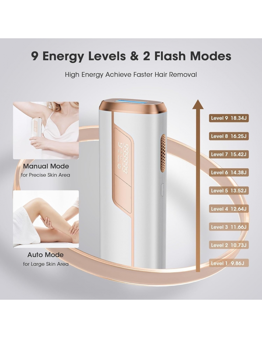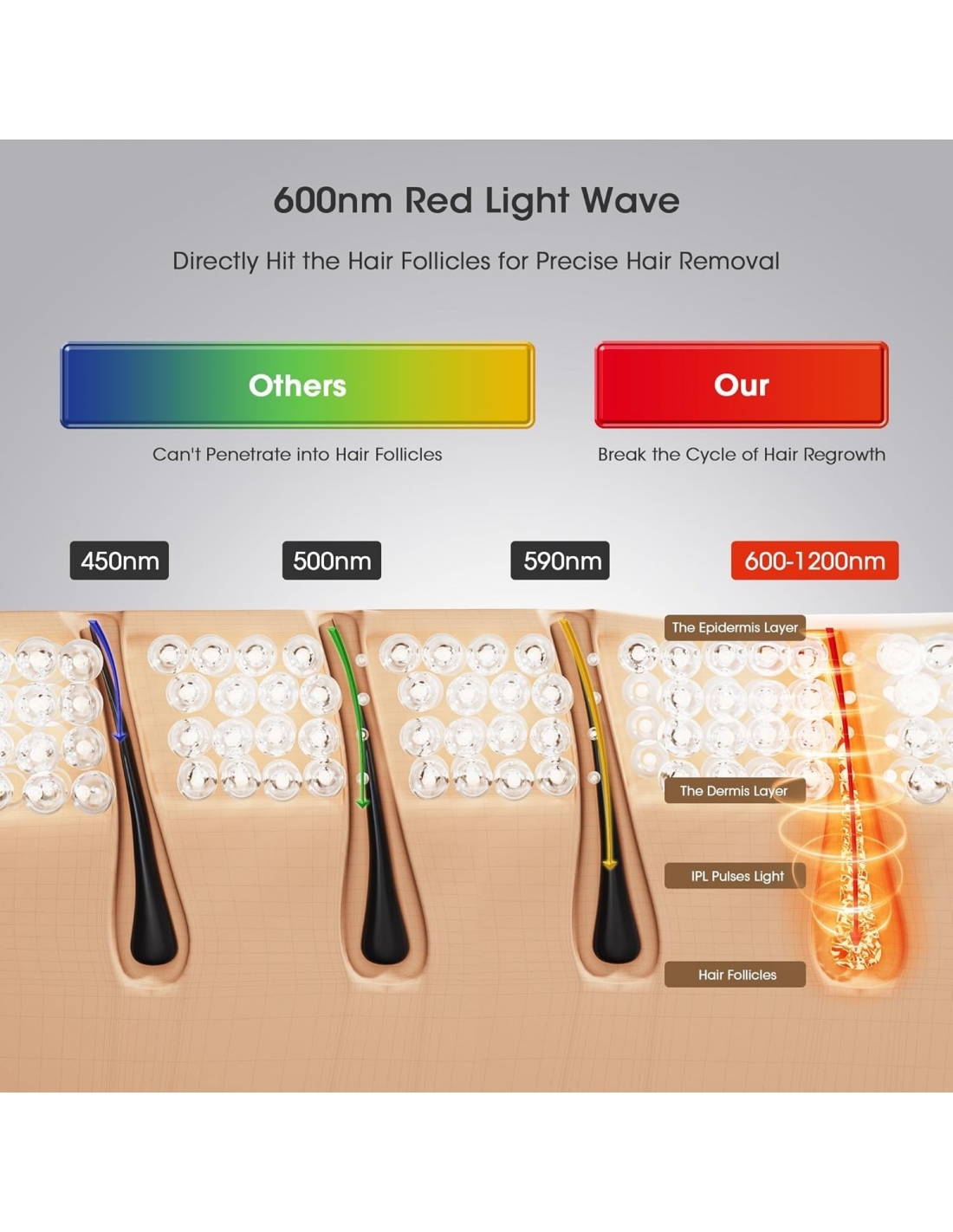 - La nostra IPL epilatore luce pulsata ha una tecnologia IPL unica, le onde di luce rossa 600-1200NM possono raggiungere direttamente il follicolo pilifero per ottenere una depilazione precisa. 9 livelli di energia regolabili per soddisfare le diverse sensibilità della pelle, per fornire diversi livelli di esperienza di trattamento più accurata, completa ed efficace.