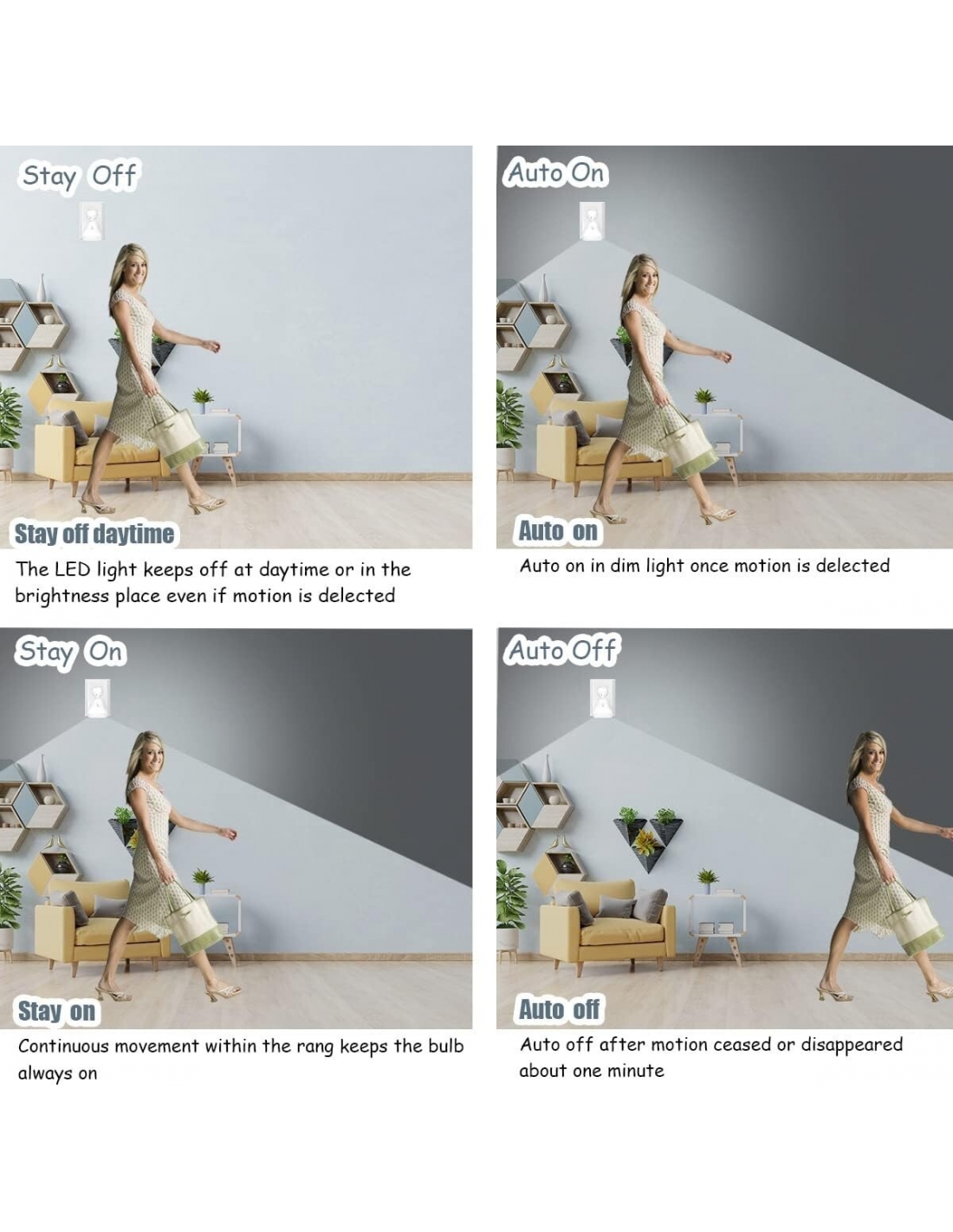 - Una soluzione di illuminazione a risparmio energetico con un sensore fotoelettrico integrato, che controlla l'attivazione della luce solo in condizioni di oscurità o scarsa illuminazione. Dopo aver rilevato il movimento, manterrà automaticamente la luce per circa mezzo minuto, quindi si spegnerà da sola o manterrà lo stato di luce fioca