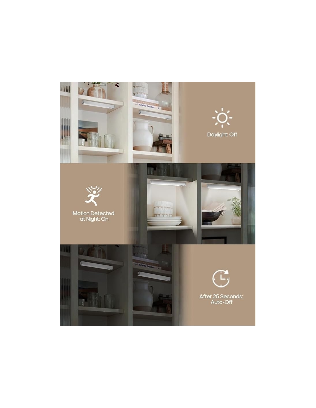 - 【Luci per Armadio con Sensore di Movimento Dimmerabili】 – Queste luci per armadi hanno due modalità di funzionamento: sensore e spento. In modalità sensore, si accendono automaticamente quando viene rilevato un movimento in un ambiente buio e si spengono automaticamente dopo circa 25 secondi se non viene rilevato alcun movimento.