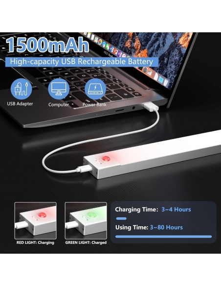 - Ricaricabile USB: la batteria ricaricabile ad alta capacità incorporata, si ricarica facilmente tramite USB. Ci vogliono solo 4 ore per una ricarica completa e può essere utilizzato fino a 30 giorni in modalità sensore di movimento. Può essere facilmente rimosso e riinstallato quando è necessario caricare la batteria della striscia LED.