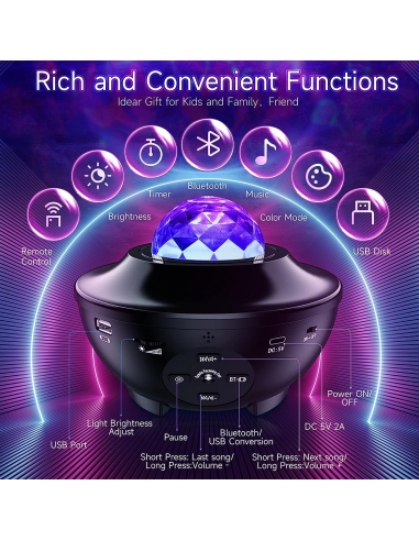 - 【Connessione Bluetooth e USB, Sensore Audio】Puoi collegare il tuo telefono al Bluetooth, oppure puoi collegare la porta USB alla porta del Proiettore Cielo Stellato per riprodurre le tue canzoni preferite. Con musica di alta qualità e cielo stellato, puoi goderti un'atmosfera rilassata e confortevole. Proiettore galassia adotta un design di attivazione del suono, che cambia in base al ritmo della musica, creando un'atmosfera più romantica e attiva.