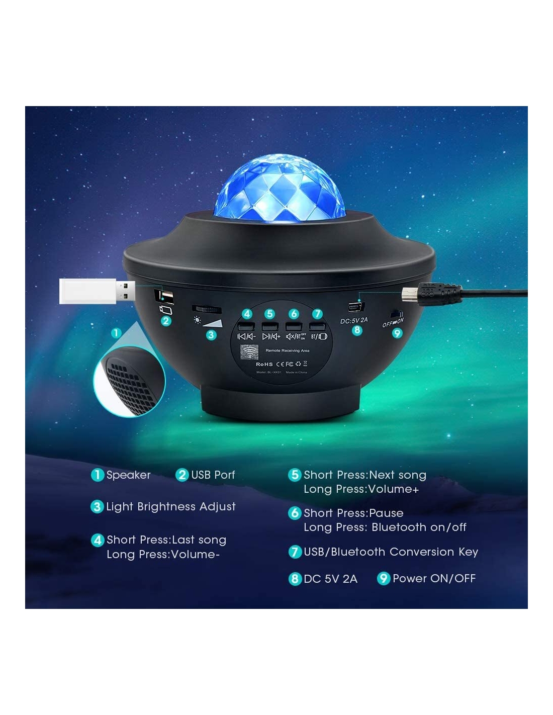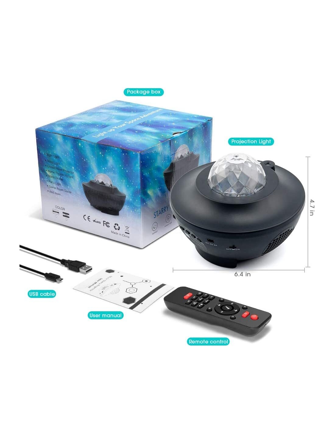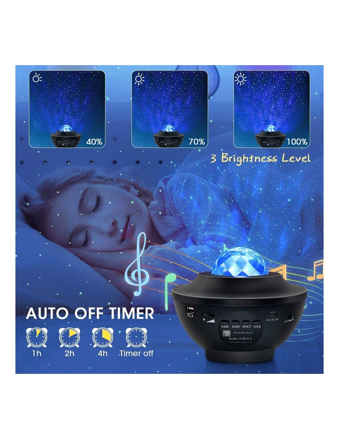 Luci a stella e 4 luci colorate (bianco, blu, rosso, verde) LED Rotazione Musicale Proiettore Lampada include 21 modalità di illuminazione sovrapponendo diversi effetti e 3 livelli di luminosità a scelta.Questa luce notturna ha una funzione timer,telecomando viene insieme. Con 3 opzioni di timer di spegnimento automatico, 1H 2H spegnimento incorporato. L'opzione timer consente di risparmiare energia e pianificare durante la notte. Non preoccuparti più di alzarti dal letto o dal divano per accendere o spegnere la luce notturna.Puoi collegare il tuo cellulare Bluetooth o collegare un'unità flash USB per riprodurre il musica soft, Il volume regolabile si adatta a te o al sonno del tuo bambino.Quando accendi le luci stellate, la tua casa passerà dallo scuro allo stupendo in pochi secondi! è possibile scegliere l'intensità della luce a seconda dell'atmosfera che si desidera creare. l'esclusiva modalità di attivazione del suono può far sì che la frequenza delle stelle delle stelle segua la frequenza del suono in costante cambiamento, le luci brillino e cambino i pattern al ritmo della musica.Puoi usarlo in molte occasioni, La delicata illuminazione a proiezione divertirti scena virtuale, per celebrare giorni, compleanni, feste memorabili, party, ed è anche una fantastica decorazione per camera da letto, palcoscenico ecc. Può essere un regalo ideale per i tuoi amici, bambini, colleghi, famiglia, ecc.