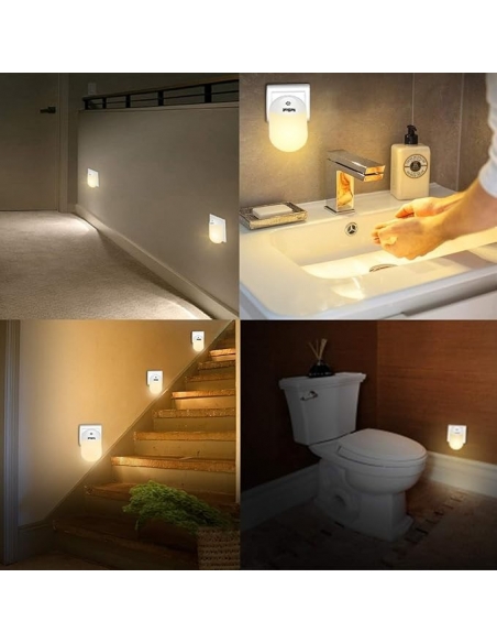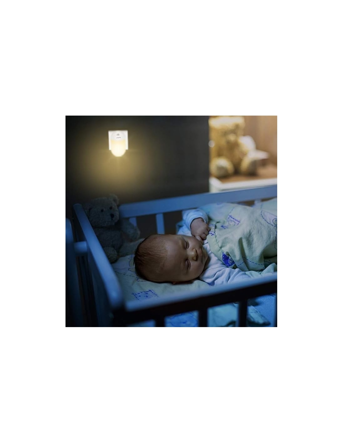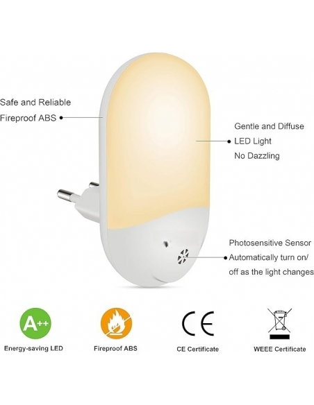 - Luce notturna automatica: si accende automaticamente quando diventa troppo buio e si spegne automaticamente quando è abbastanza luminosa. Si può lasciare la luce notturna nella presa di corrente, in quanto si accende solo quando diventa più buio.