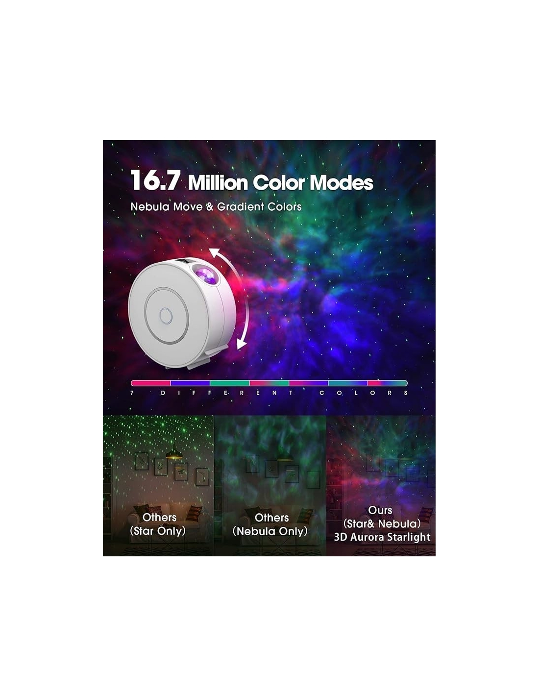 - 【 Fai da te 16.7 milioni di modalità di colore & effetti immagine realistici 3D 】 Lampada con proiettore a stelle Aurora Blue incorporata, può ottenere una risoluzione dell'immagine più elevata e un effetto cielo stellato più realistico. È possibile anche regolare liberamente i cambiamenti di colore della nebbia (blu, rosso, verde, bianco e sfumato). La nebbia che si muove lentamente e le stelle scintillanti creano un riflesso.