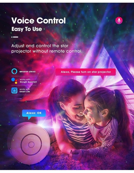 - 【Smart Life Controllo intelligente e condivisione familiare】 il proiettore a LED può essere collegato con l'applicazione Smart Life sul telefono, rispetto al telecomando è più intelligente e comodo. Accensione e spegnimento intelligenti, cambiare la luce, regolare la luminosità, riprodurre musica e soddisfare le vostre esigenze di controllo intelligente. E può condividere l'attrezzatura con la famiglia.