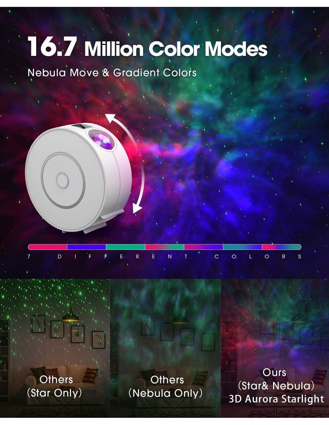 - 【 Fai da te 16.7 milioni di modalità di colore & effetti immagine realistici 3D 】 Lampada con proiettore a stelle Aurora Blue incorporata, può ottenere una risoluzione dell'immagine più elevata e un effetto cielo stellato più realistico. È possibile anche regolare liberamente i cambiamenti di colore della nebbia (blu, rosso, verde, bianco e sfumato). La nebbia che si muove lentamente e le stelle scintillanti creano un riflesso.