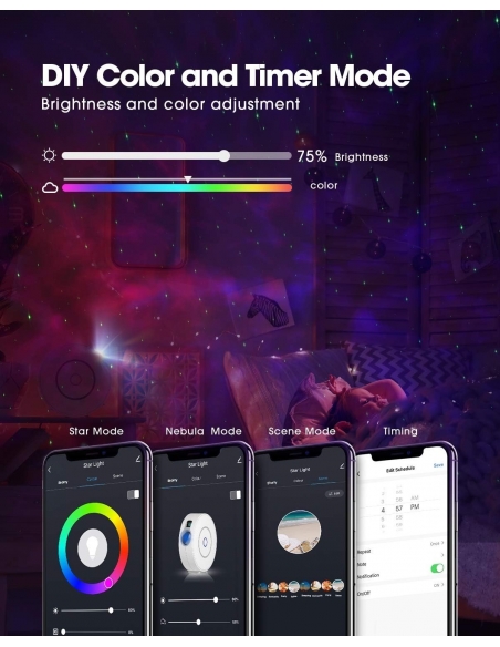 - 【Modalità 4 scene & funzione timing】Le impostazioni della scena sono state aggiunte (dormire, romanticismo, festa/relax) sono disponibili quattro diversi tipi di impostazioni, può essere adattato a diverse occasioni per ottenere un'esperienza ancora più intensa. Inoltre, è possibile impostare il tempo di accensione e spegnimento automatici, con l'avanzata tecnologia di riduzione del rumore per dormire più tranquillamente.
