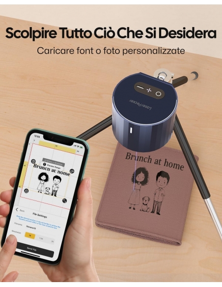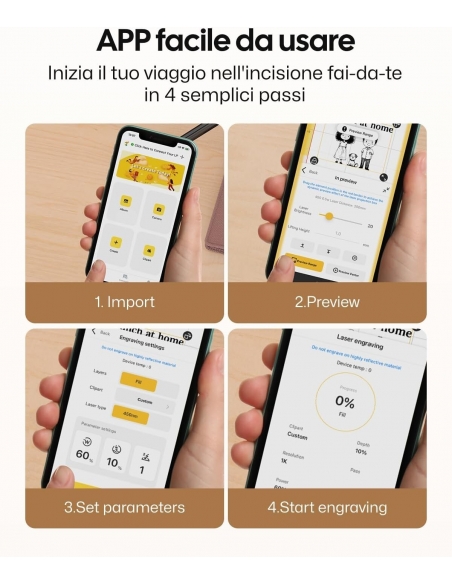- Plug and Play: basta avviare l'applicazione LaserPecker e stabilire una connessione Bluetooth per l'incisione con una semplice pressione; si prega di notare che la distanza del laser deve essere mantenuta a 20 cm. L'incisore LP1 Pro può supportare una dimensione massima di incisione di 100 x 100 cm, e può essere utilizzato per caricare un'immagine, inserire testo o importare un file G-code tramite APP LaserPecker Disponibile sul mercato delle applicazioni). Ideale per incidere etichette e decorazioni su portafogli, laptop, custodie per cellulari, ecc. piuttosto che per grandi progetti di incisione.