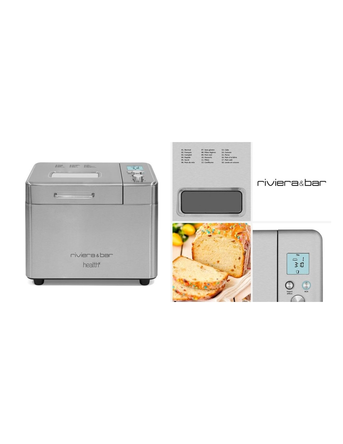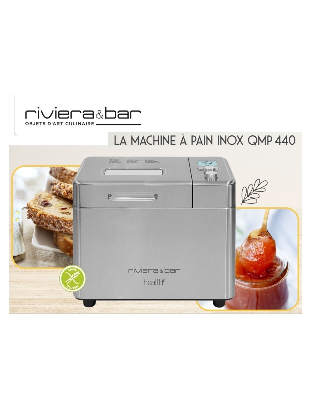 Macchina del pane Health Riviera & Bar QPM440 per la produzione di pane senza glutine e pani speciali: 1 programma specializzato Pane senza glutine e programmi pane speciale: pane nero, pane alla birra, pane integrale, pane salato. 2 Programmi di impasto: uno per impasti pesanti e uno per impasti leggeri (pasta per waffle, pasta per frittelle, pasta frolla). Preparazioni diversificate: dolci, marmellate, torte.