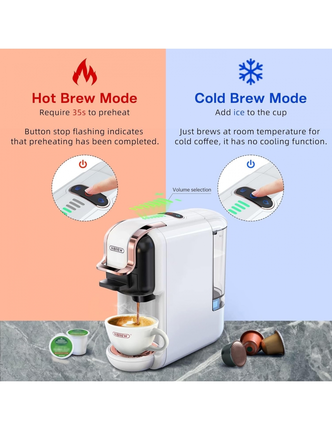 - Modalità caffè caldo e freddo e indicatore di erogazione a LED: La macchina da caffè funziona in modalità calda e fredda, consentendo di gustare il caffè sia caldo che freddo (si noti che la modalità calda richiede circa 35 secondi di preriscaldamento). NUOVO AGGIORNAMENTO HiBREW: INDICATORE A BARRE LED - Allineare le barre LED con le barre della capsula DG*. Regolate il volume di erogazione di conseguenza e avrete una tazza di delizioso caffè pronta in 1,5 minuti!