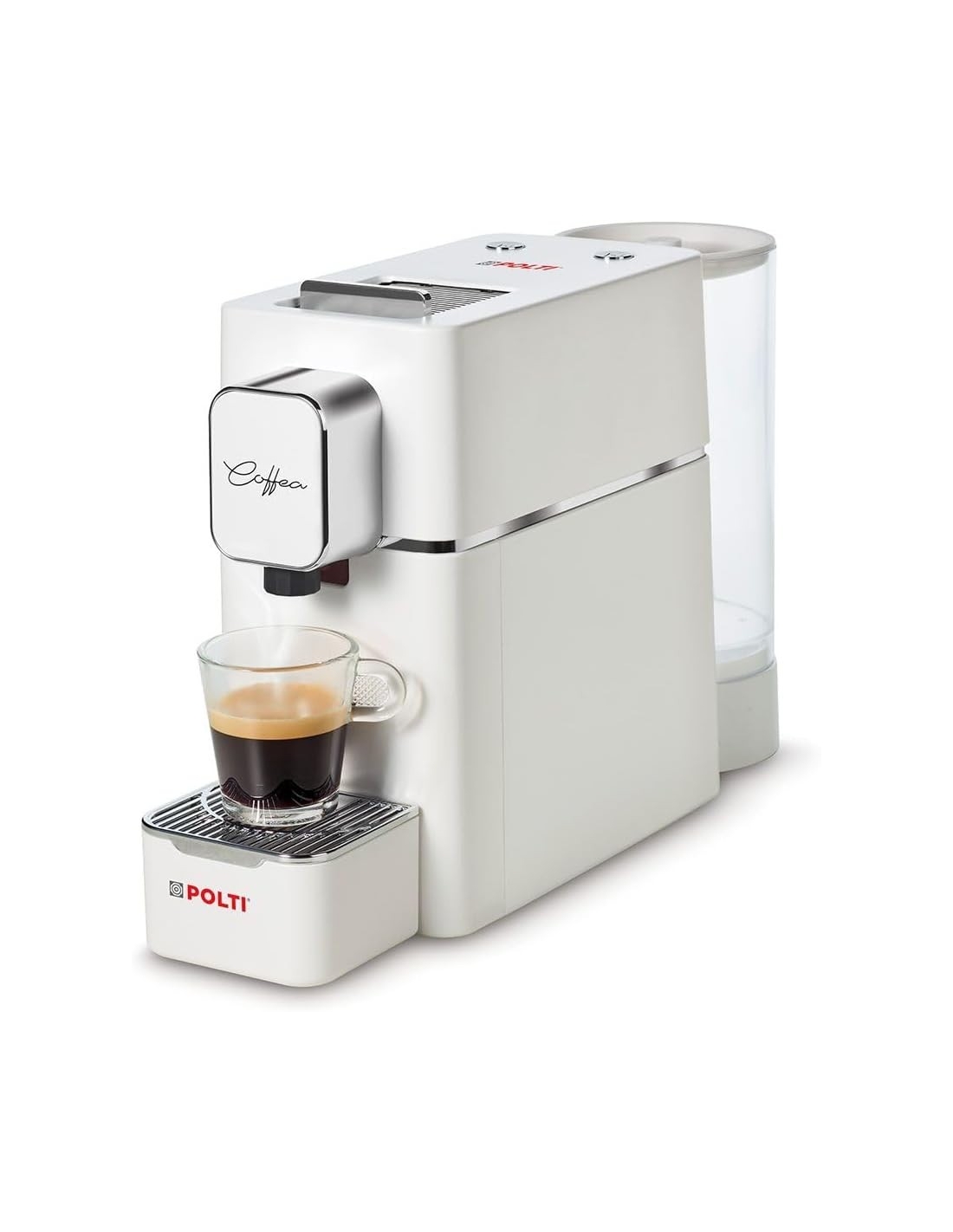 Potenza in Watt: 1400,000-Capacit serbatoio acqua (lt): 0,850-Numero di tazze: 1,000-Regolazione intensit caff: No-Utilizzo cialde: S-Sistema a capsule: No-Tipo capsule: No-Espulsione automatica capsula: S-Indicatore livello dell'acqua: No-Polti Coffea una macchina a cialde E.S.E. (Easy Serving Espresso, una cialda monodose con un diametro standard da 44 mm) che unisce caratteristiche innovative e pratiche ad un design elegante e compatto. La cialda viene inserita nel vano superiore ed espulsa all?interno del cassetto raccogli cialde quando si apre lo sportellino superiore. Polti Coffea ti consente inoltre di personalizzare l?erogazione e la temperatura del tuo espresso, per gustare in ogni momento un ottimo caff.Ciclo di lavaggio e pulizia automatico: NoErogatore caff regolabile in altezza e profondit: NoGruppo erogatore estraibile: NoVapore rapido: NoVaschetta raccogligocce: SAccessori in dotazione: Incluse 54 cialde E.S.E. da 44 mm (3 confezioni da 18 pz. l?una: 1 Vietnam, 1 Uganda e 1 Tanzania)Anni di garanzia del costruttore: 2,000Altezza (cm): 23,000Larghezza (cm): 35,000Profondit (cm): 10,500
