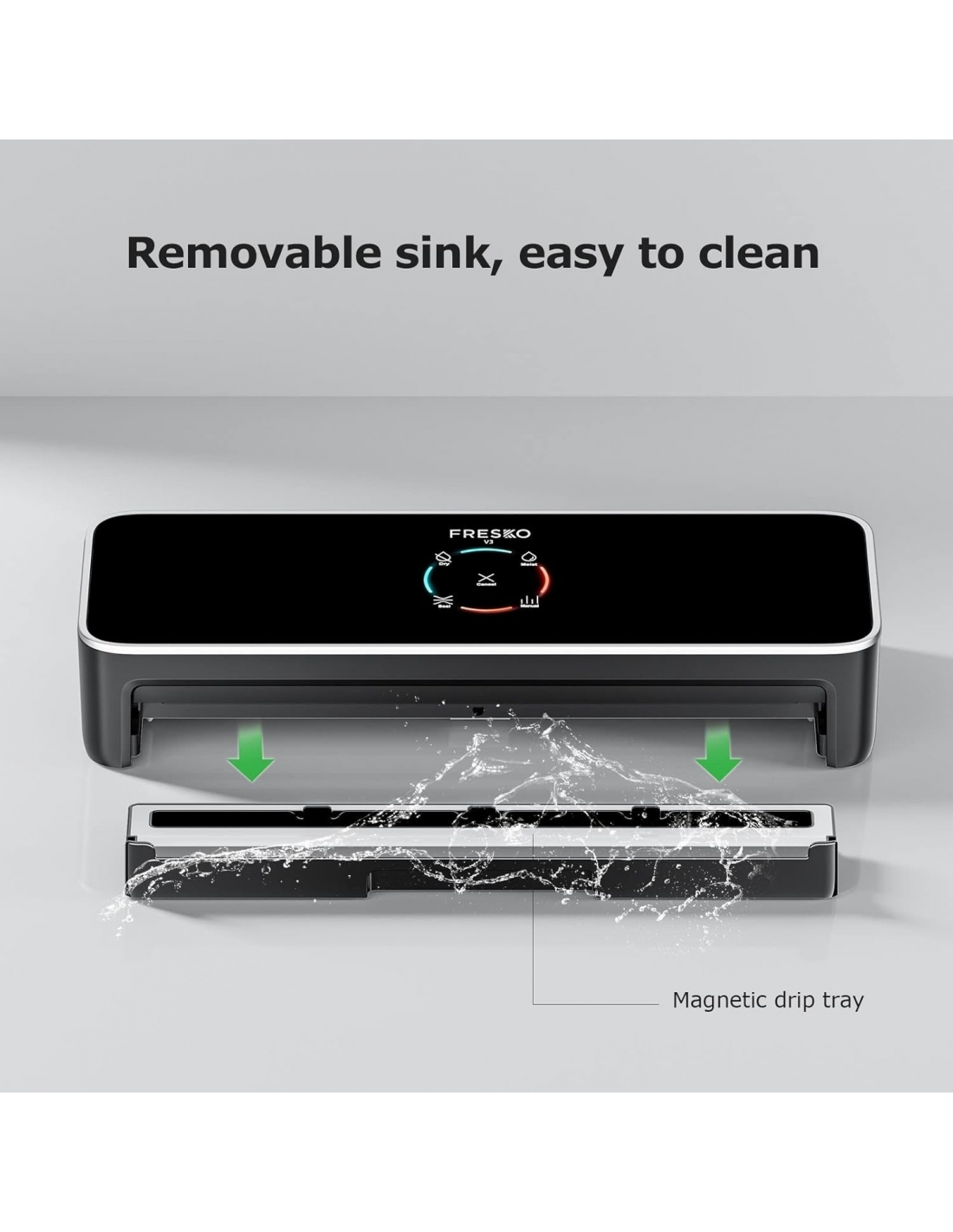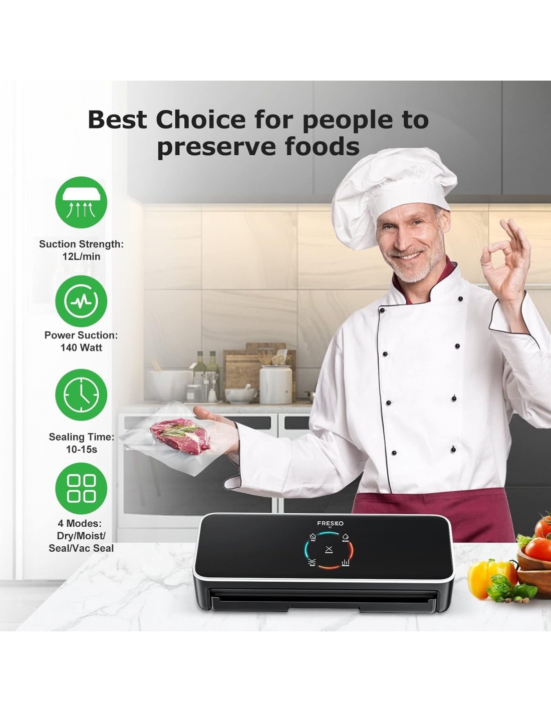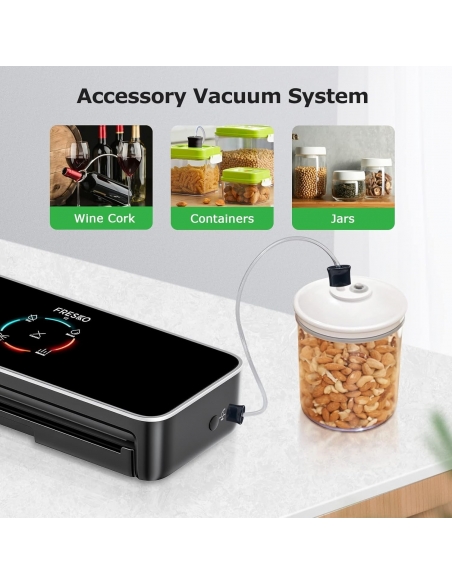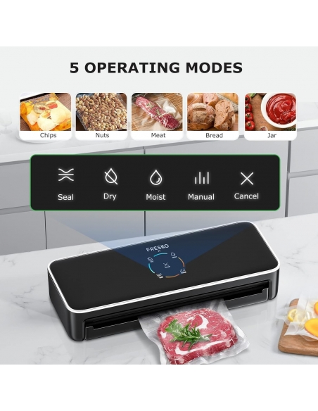 - Macchina sottovuoto multimodale: il saldatore per pellicole FRESKO dispone di modalità di asciugatura e umidità, adatte per diversi alimenti. Può essere utilizzato anche come macchina sottovuoto Sous Vide.
