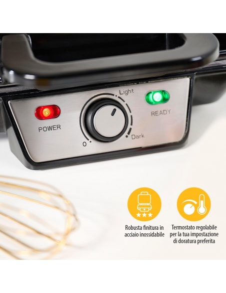 - Grazie al termostato, puoi scegliere come desideri cucinare i tuoi waffle