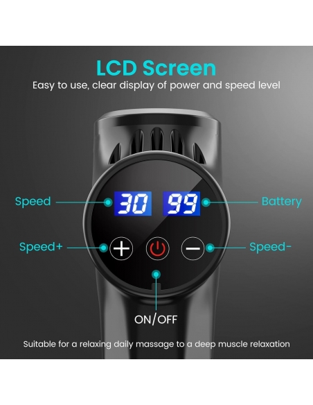 - 【💪LCD Touchscreen】: La schermo LCD capace di visualizzare la velocità, la batteria rimanentei, il tempo e l’accensione/spegnimento del pistola massaggio, tant’è che basta tasti touch sensitive + e - per selezionare le impostazioni desiderate. Facilissima da usare anche per i meno esperti.