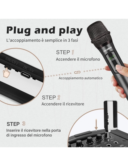 - Collegare e giocare - Il kit microfoni wireless viene fornito con 1 ricevitore microfonico; basta accendere il microfono senza fili e il ricevitore per abbinarli automaticamente, senza doverli abbinare manualmente. Quando l'apparizione è avvenuta, inserire il ricevitore in un apparecchio con una presa d'ingresso MIC e utilizzarlo direttamente.