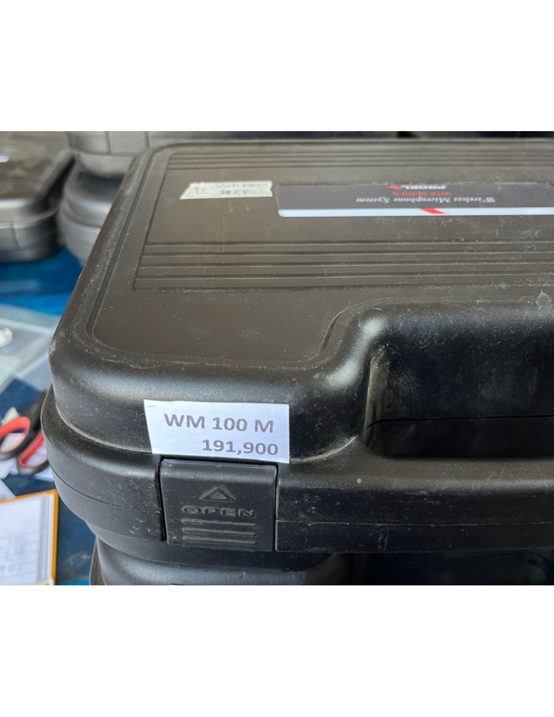 I radiomicrofoni della serie WM100 sono sistemi VHF a singola frequenza controllata al quarzo, caratterizzati da una trasmissione affidabile e di ottima qualità. Il sistema radiomicrofonico WM100M è composto da ricevitore WM100 e trasmettitore a mano WM1M. Sono disponibili 5 frequenze diverse preselezionate in fabbrica, accuratamente scelte per permettere l’uso simultaneo di 5 apparati senza che questi interferiscano fra di loro.