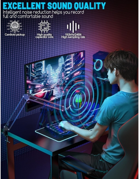 - Audio di Alta Qualità - Contiene un nucleo microfonico a condensatore da 14 mm di alta qualità, frequenza di campionamento elevata a 192 kHz/24 bit, isolamento intelligente dei rumori laterali e di fondo per una voce più pulita e chiara. Pickup a puntamento cardioide per catturare il suono completo