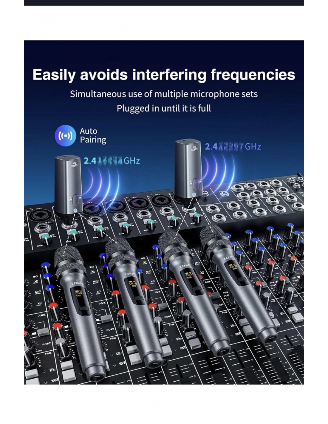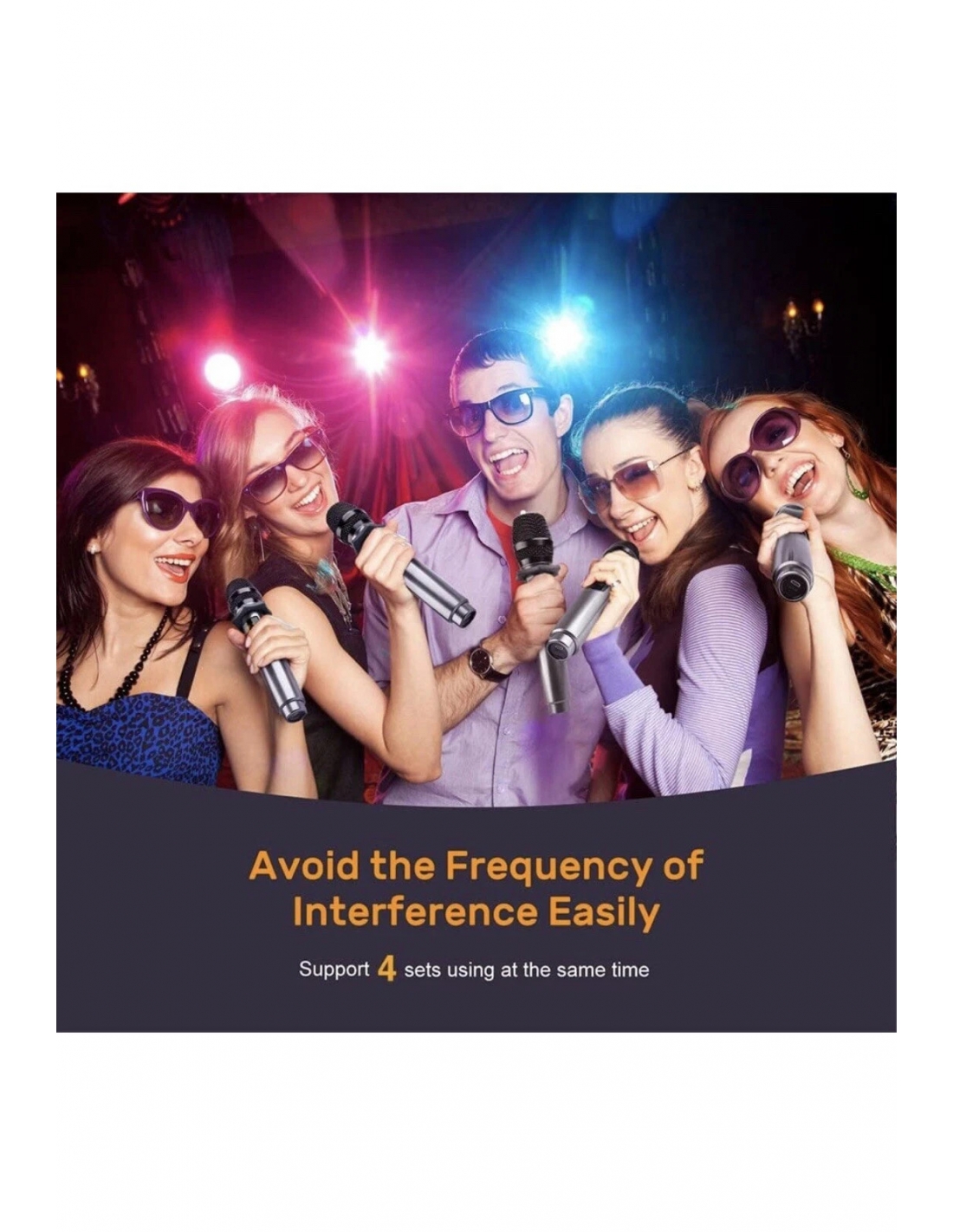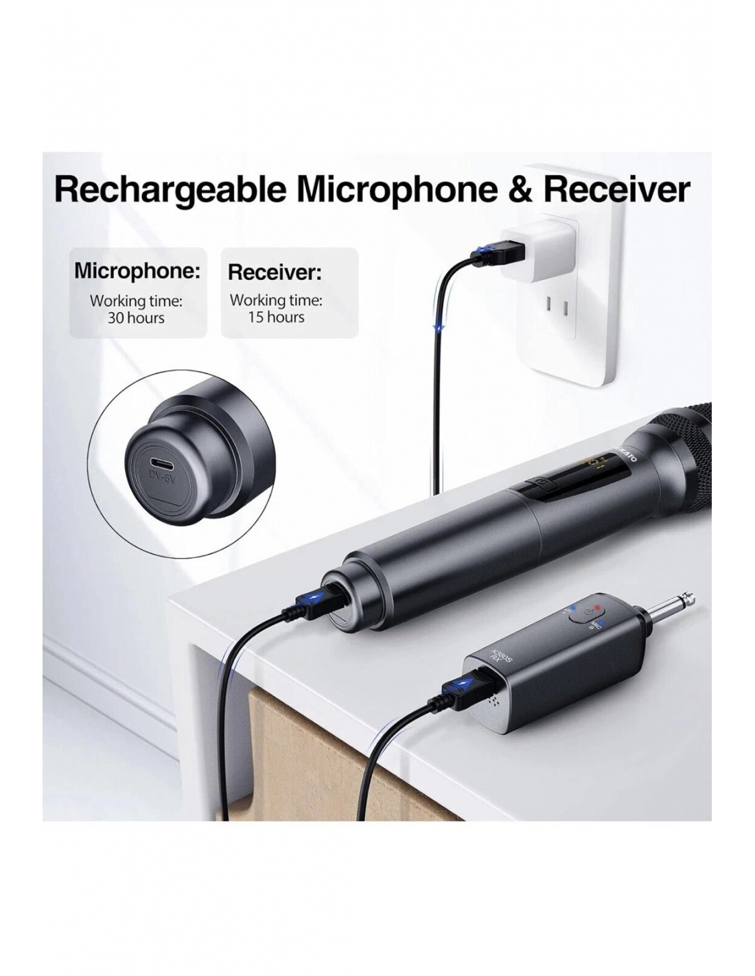 Il ricevitore adotta un jack audio da 6,35 mm, che può essere collegato direttamente a qualsiasi impianto audio (particolarmente adatto per karaoke, discorsi, riunioni, performance, al chiuso o all'aperto.