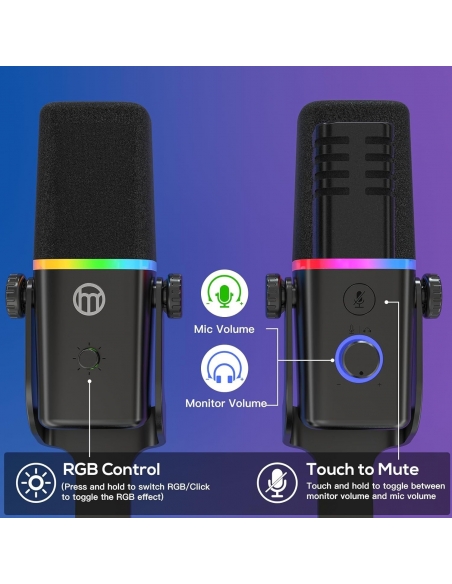 - Altri tasti funzione: questo microfono podcast è dotato di un versatile regolatore del volume due in uno. Basta toccare e tenere premuto il pulsante Mute per passare dalla modalità monitor al controllo del volume del microfono. Il controllo del volume si illumina di verde per il controllo del volume del microfono e blu per il controllo del volume del monitor. Questo design intuitivo offre facilità d'uso e un aspetto pulito e professionale, perfetto per i creatori di contenuti che necessitano di una gestione efficiente dell'audio.
