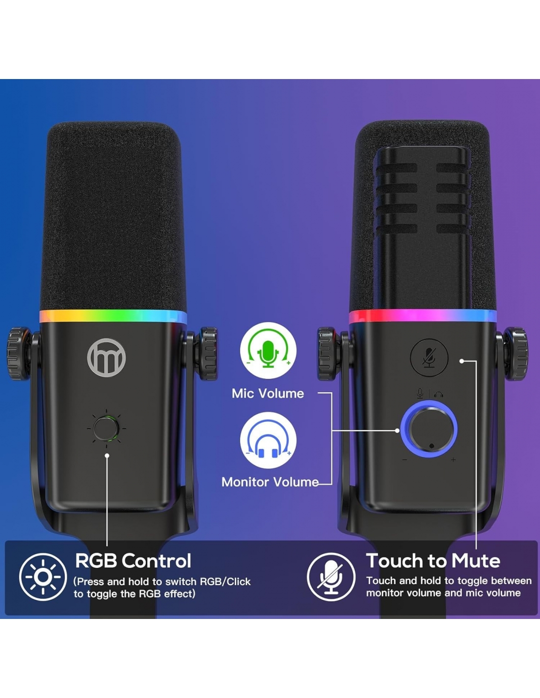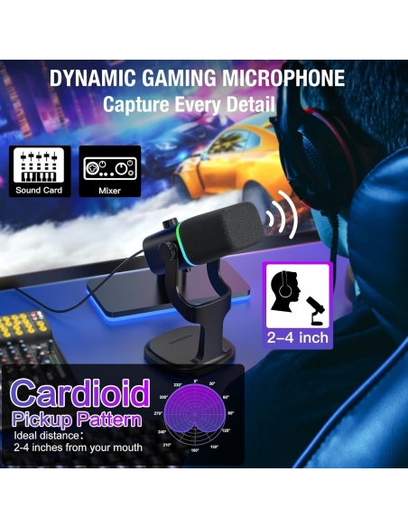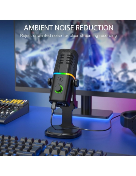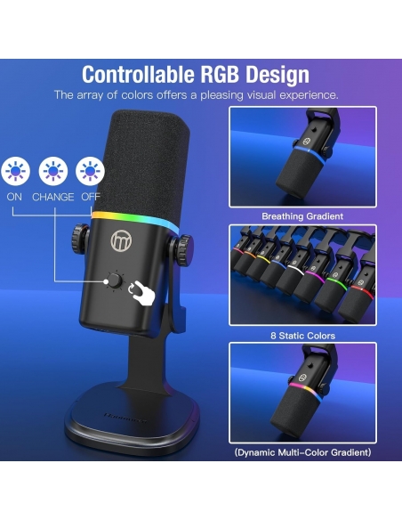 - 【Luce RGB brillante e controllabile】 Il microfono da gioco per computer migliora la configurazione di gioco con l'illuminazione RGB regolabile e garantisce un'esperienza visivamente impressionante. Basta tenere premuto il pulsante RGB per cambiare i colori o fare clic per attivare l'effetto RGB. Inoltre, la funzione di memoria del microfono ricorda la tua ultima selezione di colori e si accende automaticamente quando viene accesa (nota: questa funzione funziona solo con connessioni USB; con XLR non c'è alimentazione).