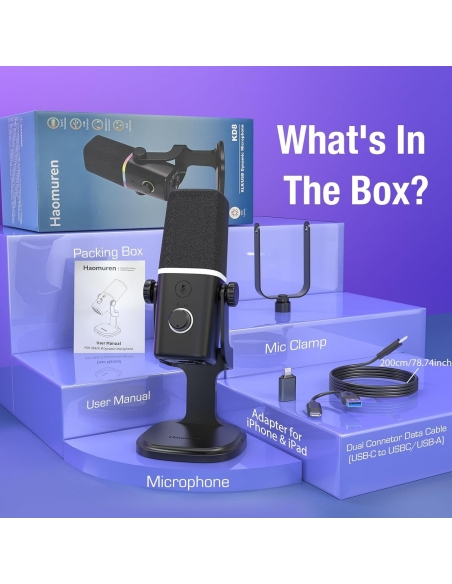 Haomuren KD8 Microfono dinamico XLR/USB per podcast di gioco, per *Phone, Telefono, PC, microfono da gioco con luce RGB, tasto muto, amplificazione del microfono, supporto desktop, cantare, YouTube