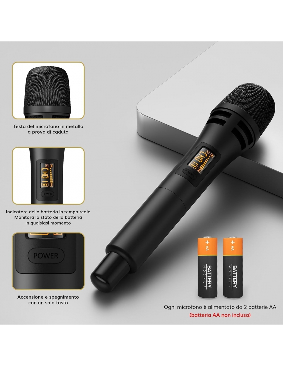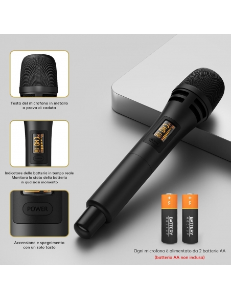 - Lunga durata di lavoro: Ogni microfono è alimentato da 2 batterie AA per garantire la sua lunga durata di lavoro (batterie AA NON INCLUSE). Il ricevitore con una batteria ricaricabile integrata da 1500mAh per 5-6 ore di utilizzo continuo con solo 2-3 ore di ricarica. Realizzato in vernice metallica e plastica ABS, questo microfono è leggero e resistente per l'uso in movimento. Lo schermo mostra la durata della batteria e la potenza del segnale per prestazioni ottimali.