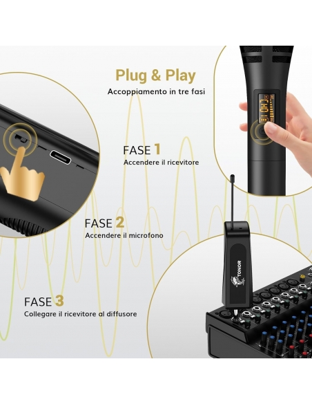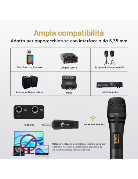 - Plug & Play: il nostro ricevitore offre una connettività semplice tramite un jack per microfono da 6,35 mm, che lo rende adatto all'uso con macchine per karaoke, altoparlanti amplificati, amplificatori, mixer e interfacce audio. Si noti che questo sistema non è compatibile con telefoni cellulari, computer o tablet.