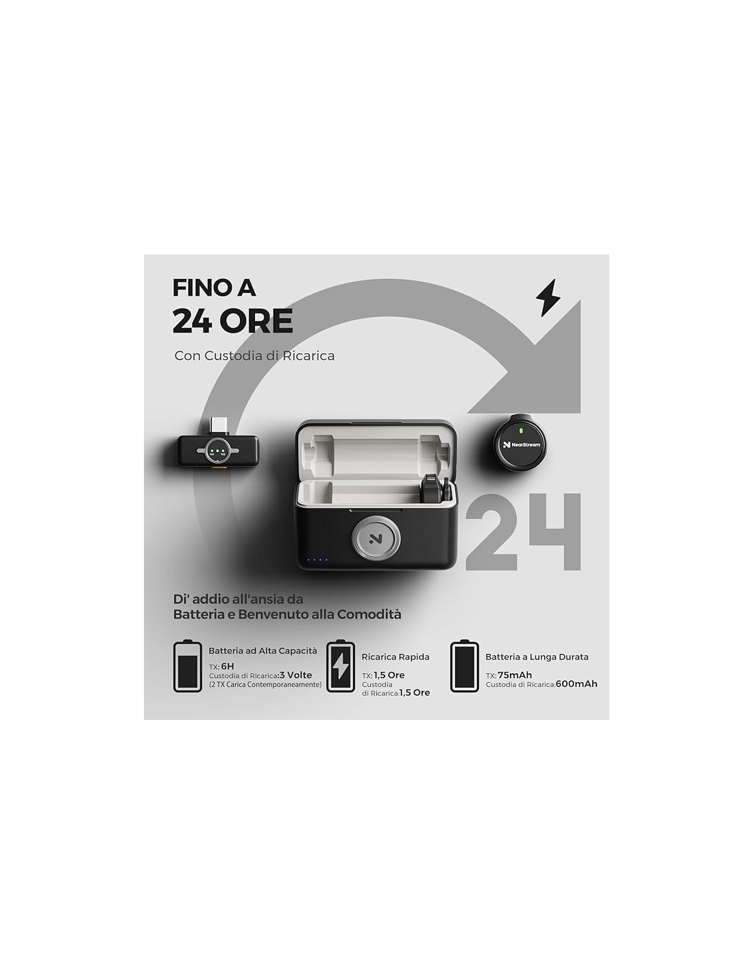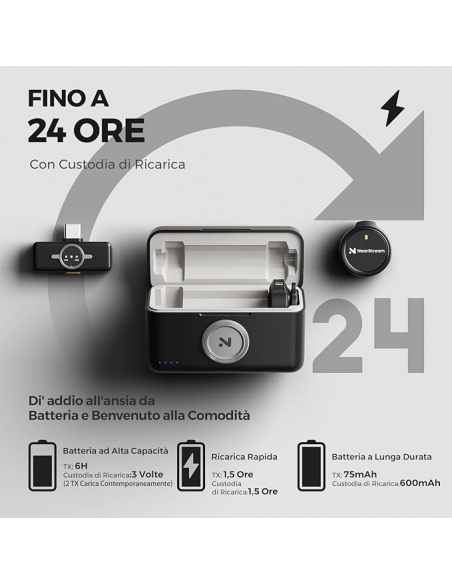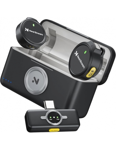 - 【Lunga Durata della Batteria 】:Il kit microfono lavalier wireless NearStream contiene due trasmettitori con microfoni omnidirezionali integrati , un ricevitore e una custodia di ricarica.Il trasmettitore può essere utilizzato per 6 ore dopo una ricarica di 1,5 ore; la custodia di ricarica può fornire 3 cariche complete per due trasmettitori dopo una ricarica di 1,5 ore.