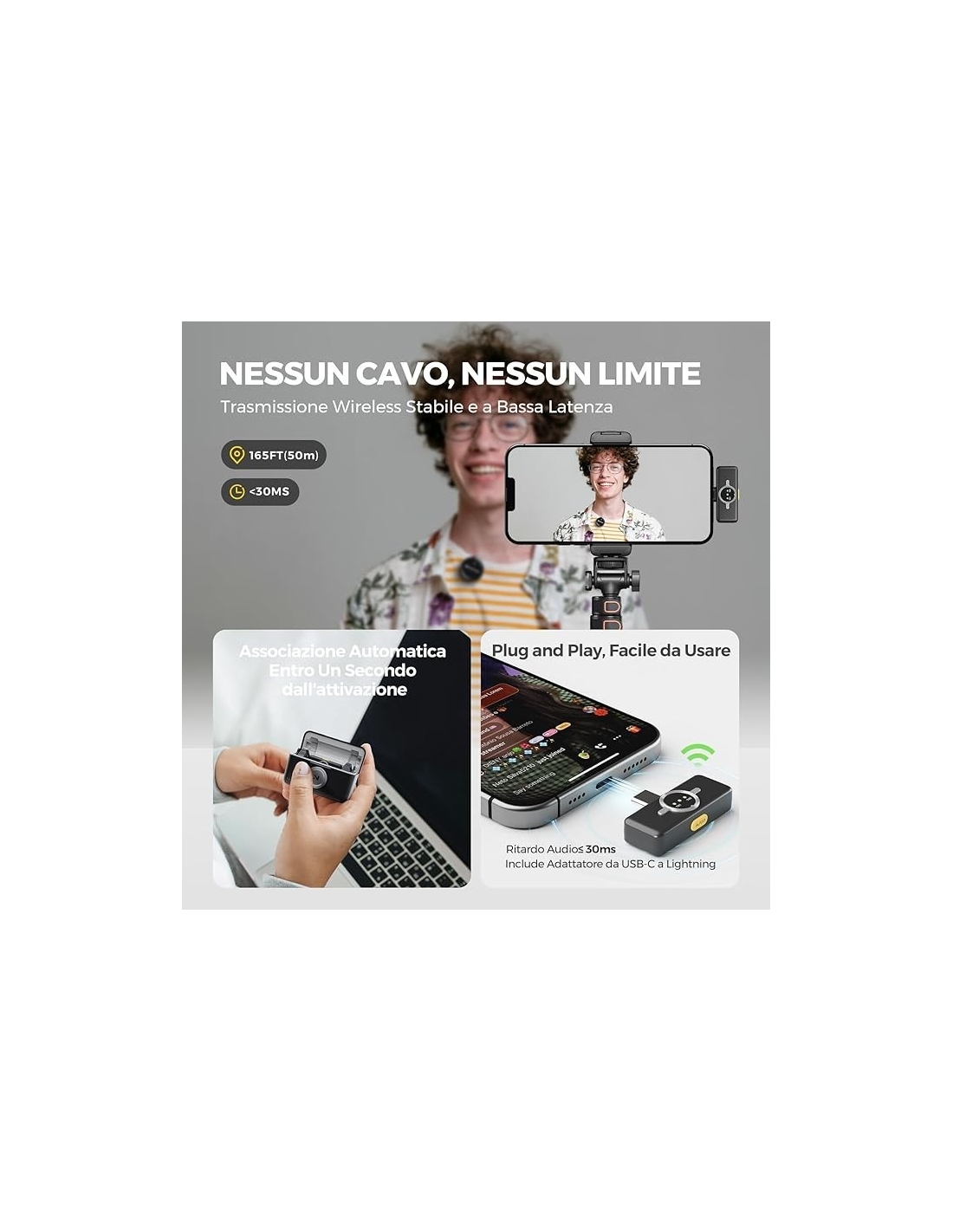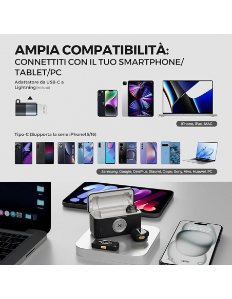- 【Plug & Play】: Non è necessario installare alcuna app o utilizzare cavi ingombranti. Basta collegare il ricevitore al dispositivo e accendere il microfono per iniziare a registrare. La tecnologia di trasmissione wireless permette una distanza di trasmissione fino a 50 metri(In assenza di ostacoli), offrendo una notevole libertà di movimento durante l'uso.