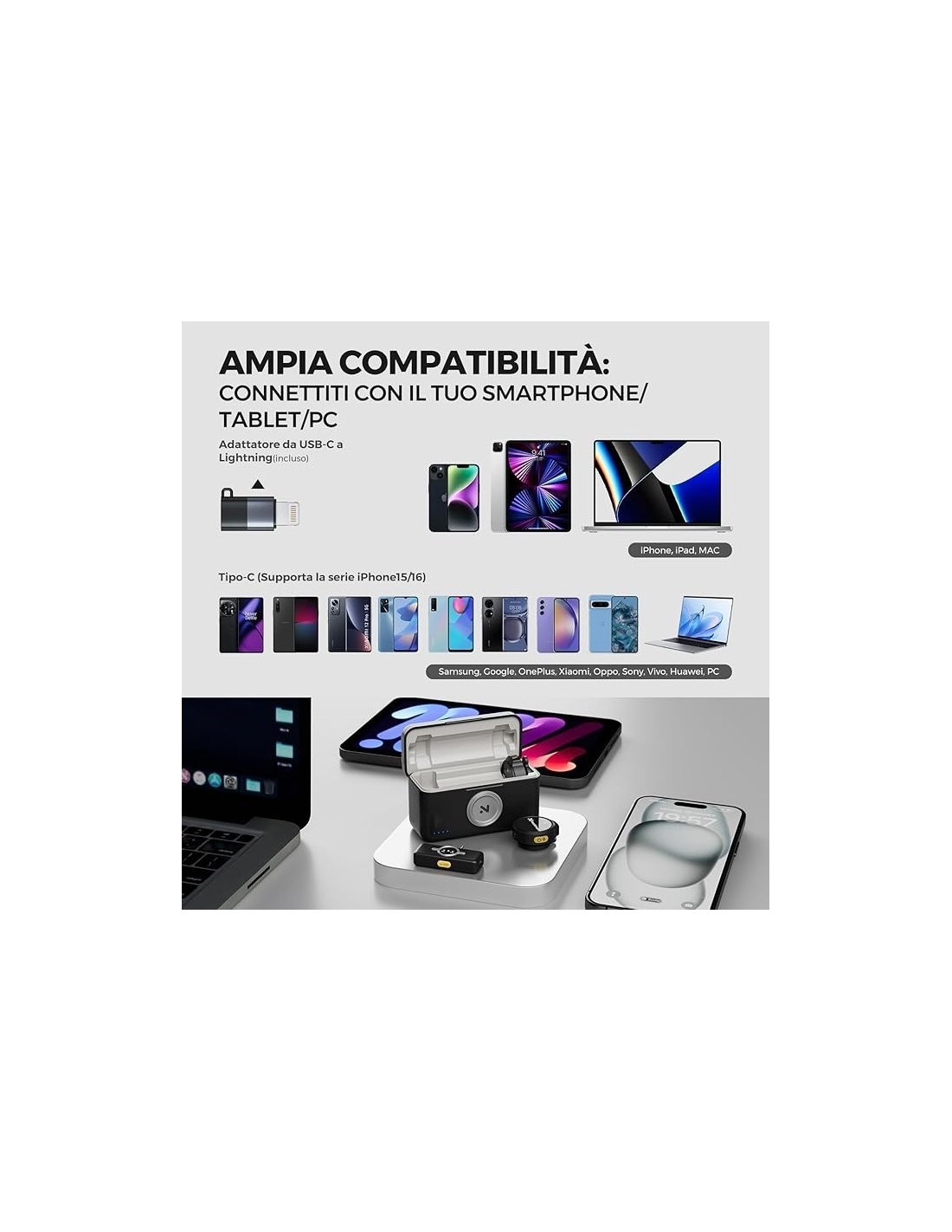 - 【Ampia Compatibilità】:Applicabile a vari dispositivi, tra cui smartphone, Android, iPhone (incluso iPhone 16), Mac, laptop e computer desktop. Il microfono supporta diverse piattaforme di live streaming come Facebook, YouTube, Instagram e TikTok, rendendolo uno strumento versatile per creatori di contenuti di vario genere.