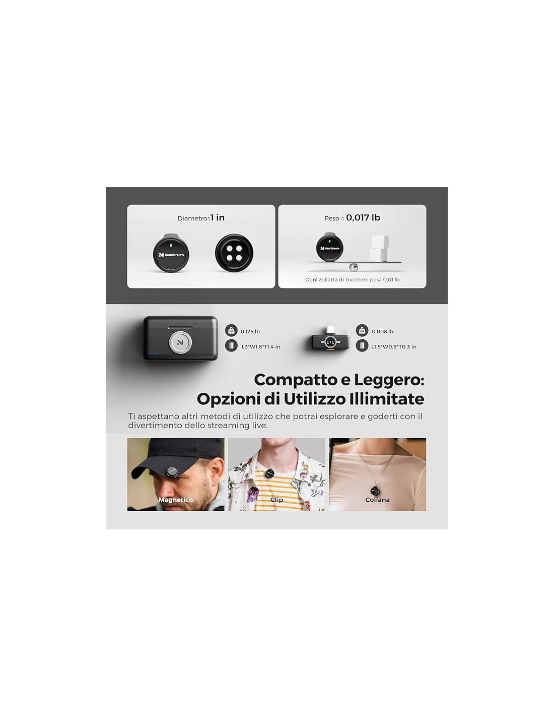 - 【Tre metodi di Indossaggio】:I trasmettitori con modalità silenziosa e funzione di riduzione del rumore pesano solo 8,2 grammi ciascuno, sono piccoli e leggeri, facili da trasportare e da utilizzare. Tre modi per indossarlo: puoi attaccarlo ai vestiti con il magnete incluso, agganciarlo ai vestiti con clip magnetica o indossarlo come collana.