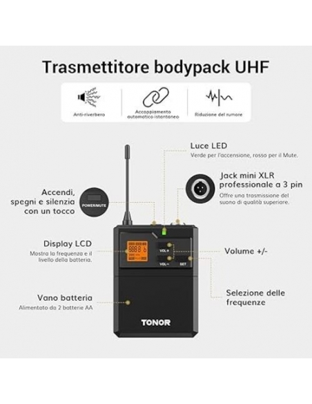 TONOR TW621 Microfono Wireless UHF con Microfono archetto/Lavalier
