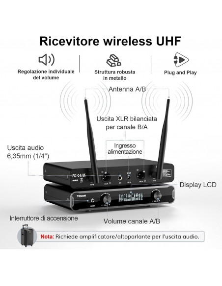 - Frequenze regolabili: ogni microfono per karaoke è dotato di 5 canali UHF regolabili, per evitare interferenze radio. Si possono utilizzare fino a 10 microfoni allo stesso tempo. La funzione multicanale assicura una comoda commutazione di frequenza per prestazioni affidabili.