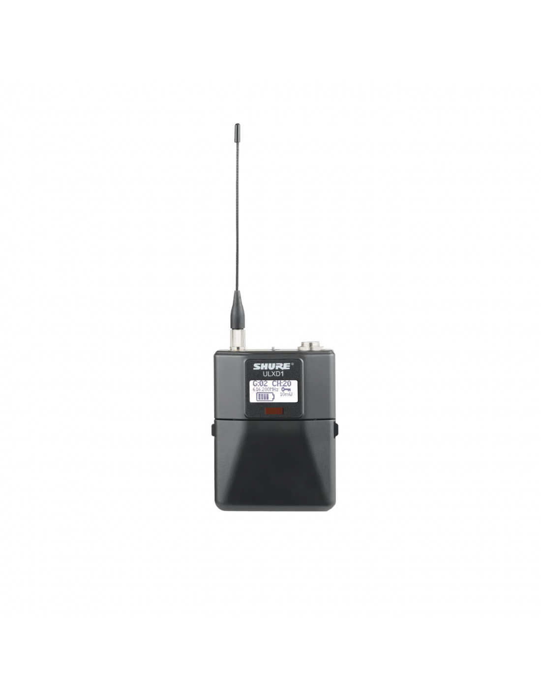 ULXD1 Shure è un trasmettitore bodypack compatibile con i sistemi radiomicrofonici digitali ULX-D. Con la sua struttura robusta ma leggera in alluminio, ULXD1 fornisce qualità audio e prestazioni RF senza compromessi, cifratura AES a 256 bit per la trasmissione sicura ed opzioni di ricarica avanzate per le applicazioni di rinforzo sonoro professionali