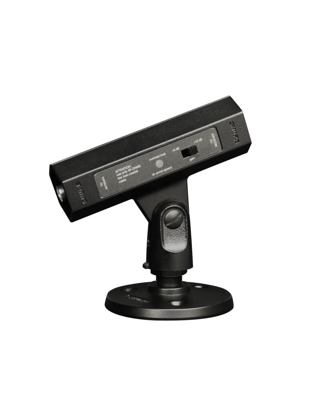 L'unità riceve alimentazione tramite la sua porta di uscita dal ricevitore Shure, dall'UABIAST o dall'amplificatore di distribuzione. Quando un'antenna è installata a distanza, l'UA834 amplifica i segnali radio ricevuti per compensare la perdita di inserzione nel cavo coassiale. Un selettore di guadagno consente la regolazione per cavi coassiali di lunghezza maggiore.