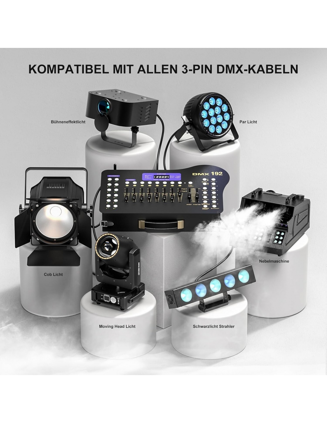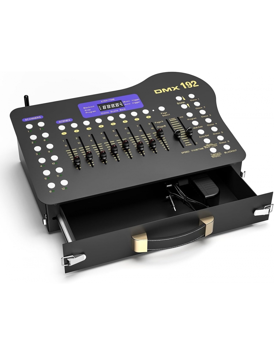 - Il controller dmx dispone di 192 canali DMX e 12 scanner con 16 canali ciascuno. Il controller dj è stato sviluppato appositamente per il facile controllo di una varietà di effetti di luce. Crea un'atmosfera da sogno e fiaba